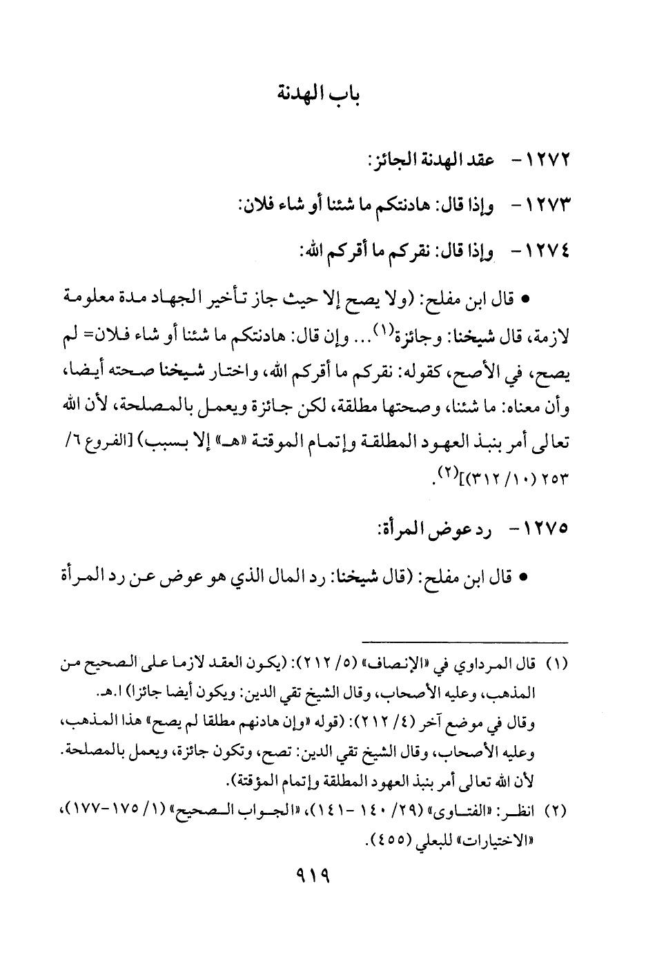 • قال ابن مفلح: (ولا يصح إلا حيث جاز تأخير الجهاد مدة معلومة لازمة، قال شيخنا: وجائزة (¬1) ... وإن قال: هادنتكم ما شئنا أو شاء فلان = لم يصح، في الأصح، كقوله: نقركم ما أقركم الله، واختار شيخنا صحته أيضًا، وأن معناه: ما شئنا، وصحتها مطلقة، لكن جائزة ويعمل بالمصلحة، لأن الله تعالى أمر بنبذ العهود المطلقة وإتمام الموقتة "هـ" إلا بسبب) [الفروع 6/ 253 (10/ 312)] (¬2).