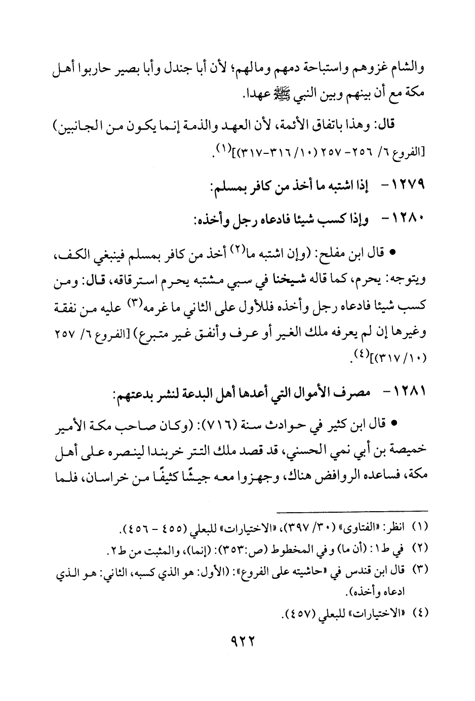 • قال ابن مفلح: (وإن اشتبه ما (¬2) أخذ من كافر بمسلم فينبغي الكف، ويتوجه: يحرم، كما قاله شيخنا في سبي مشتبه يحرم استرقاقه، قال: ومن كسب شيئًا فادعاه رجل وأخذه فللأول على الثاني ما غرمه (¬3) عليه من نفقة وغيرها إن لم يعرفه ملك الغير أو عرف وأنفق غير متبرع) [الفروع 6/ 257 (10/ 317)] (¬4).