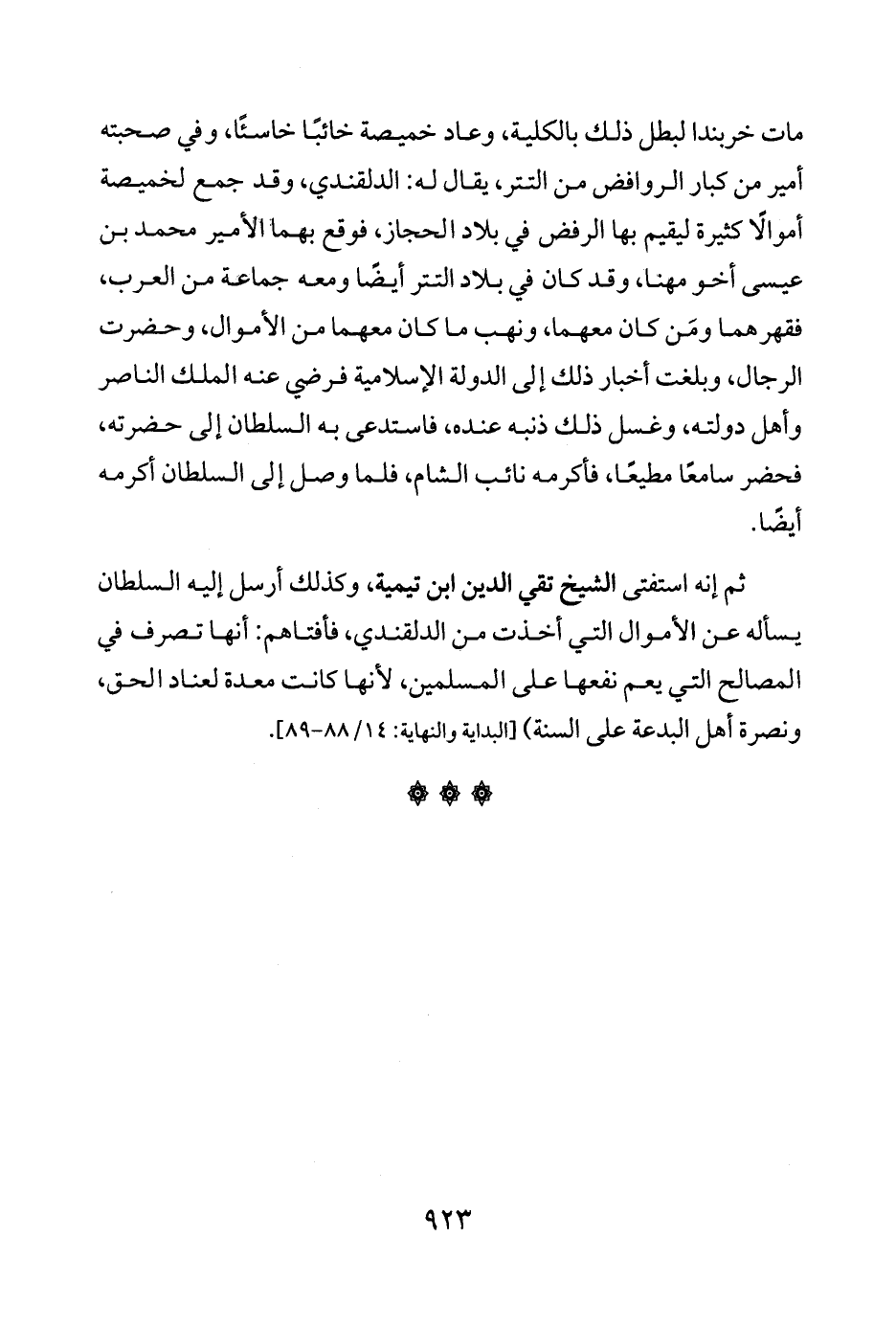 ثم إنه استفتى الشيخ تقي الدين بن تيمية، وكذلك أرسل إليه السلطان يسأله عن الأموال التي أخذت من الدلقندي، فأفتاهم: أنها تصرف في المصالح التي يعم نفعها على المسلمين، لأنها كانت معدة لعناد الحق، ونصرة أهل البدعة على السنة) [البداية والنهاية: 14/ 88 - 89].