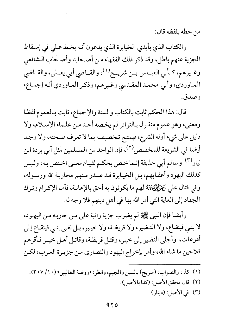 قال: هذا الحكم ثابت بالكتاب والسنة والإجماع، ثابت بالعموم لفظا ومعنى، وهو عموم منقول بالتواتر لم يخصه أحد من علماء الإسلام، ولا دليل على شيء أوله الشرع، فيمتنع تخصيصه بما لا تعرف صحته، ولا وجد أيضًا في الشريعة للمخصص (¬2)، فإن الواحد من المسلمين مثل أبي بردة ابن نيار (¬3) وسالم أبي حذيفة إنما خص بحكم لقيام معنى اختص به، وليس كذلك اليهود وأعقابهم، بل الخيابرة قد صدر منهم محاربة الله ورسوله، وفي قتال علي - رضي الله عنه - لهم ما يكونون به أحق بالإهانة، فأما الإكرام وترك الجهاد إلى الغاية التي أمر الله بها في أهل دينهم فلا وجه له.