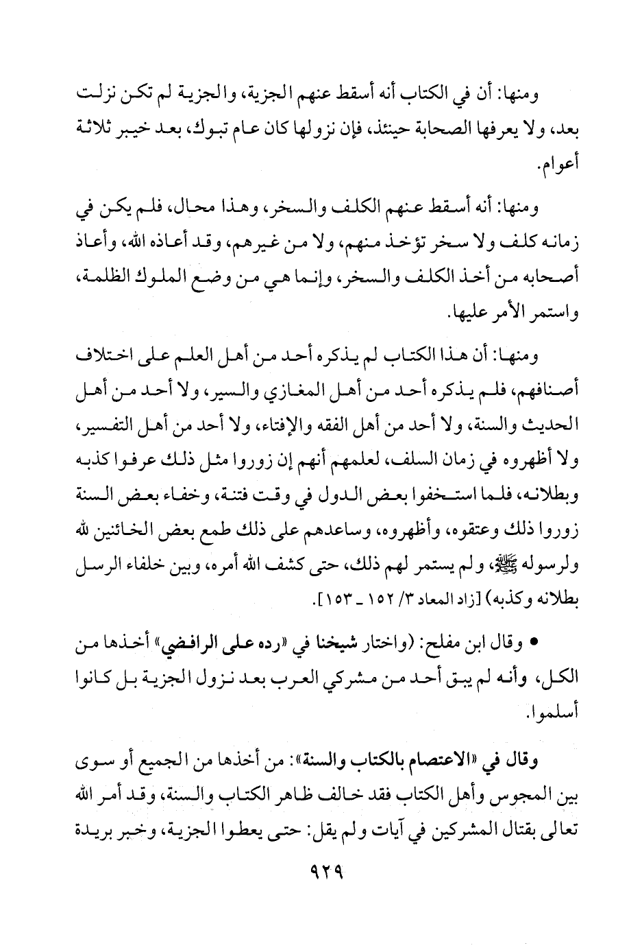 • وقال ابن مفلح: (واختار شيخنا في "رده على الرافضي" أخذها من الكل، وأنه لم يبق أحد من مشركي العرب بعد نزول الجزية بل كانوا أسلموا.