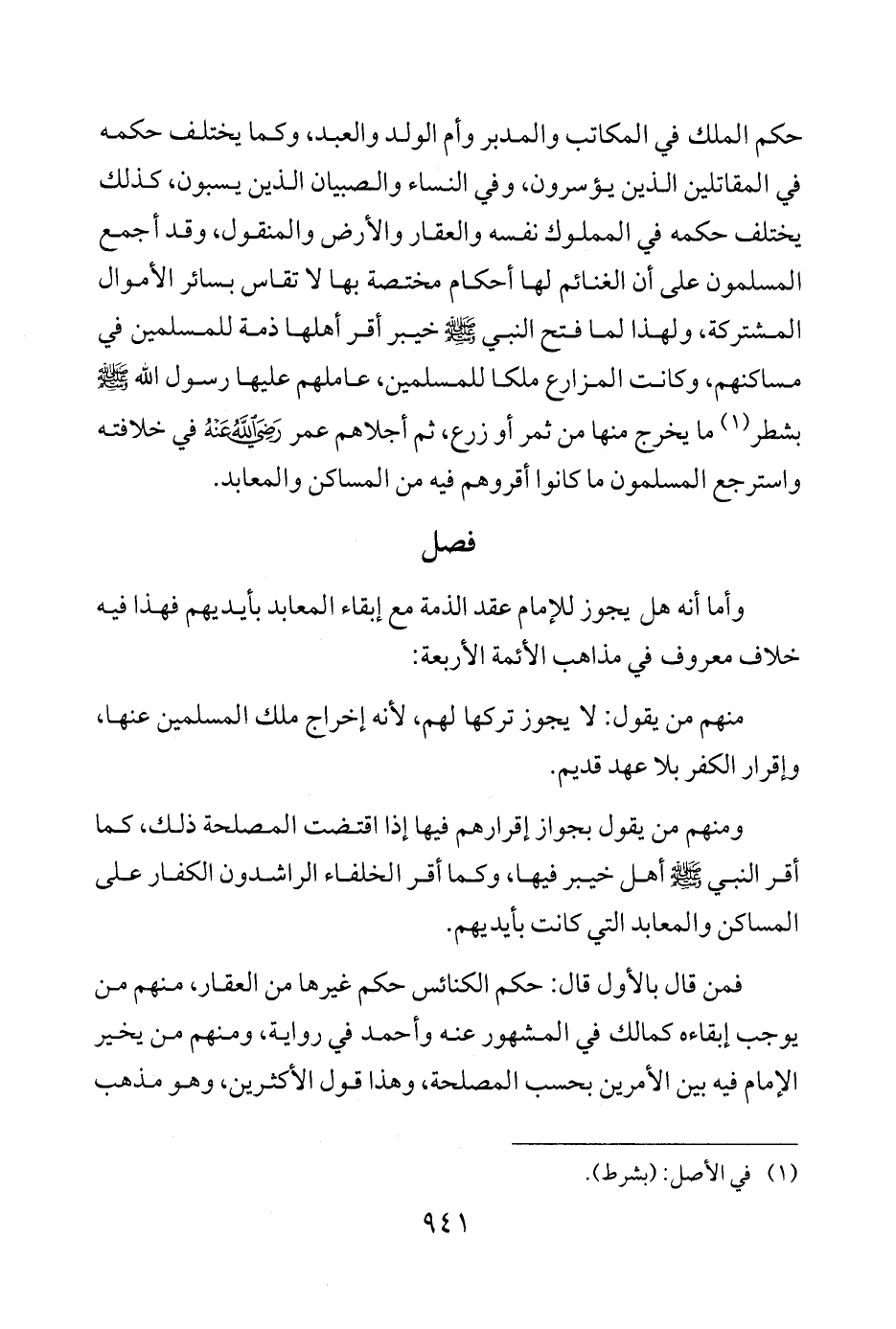 حكم الملك في المكاتب والمدبر وأم الولد والعبد، وكما يختلف حكمه في المقاتلين الذين يؤسرون، وفي النساء والصبيان الذين يسبون، كذلك يختلف حكمه في المملوك نفسه والعقار والأرض والمنقول، وقد أجمع المسلمون على أن الغنائم لها أحكام مختصة بها لا تقاس بسائر الأموال المشتركة، ولهذا لما فتح النبي - صلى الله عليه وسلم - خيبر أقر أهلها ذمة للمسلمين في مساكنهم، وكانت المزارع ملكا للمسلمين، عاملهم عليها رسول الله - صلى الله عليه وسلم - بشطر (¬1) ما يخرج منها من ثمر أو زرع، ثم أجلاهم عمر - رضي الله عنه - في خلافته واسترجع المسلمون ما كانوا أقروهم فيه من المساكن والمعابد.
