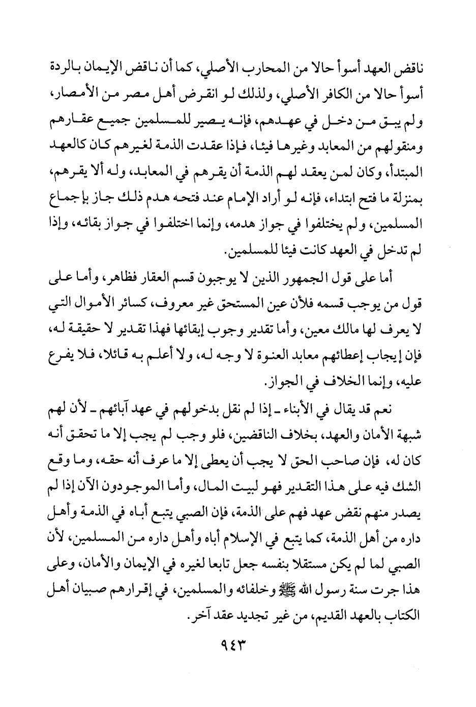 نعم قد يقال في الأبناء -إذا لم نقل بدخولهم في عهد آبائهم- لأن لهم شبهة الأمان والعهد، بخلاف الناقضين، فلو وجب لم يجب إلا ما تحقق أنه كان له، فإن صاحب الحق لا يجب أن يعطى إلا ما عرف أنه حقه، وما وقع الشك فيه على هذا التقدير فهو لبيت المال، وأما الموجودون الآن إذا لم يصدر منهم نقض عهد فهم على الذمة، فإن الصبي يتبع أباه في الذمة وأهل داره من أهل الذمة، كما يتبع في الإسلام أباه وأهل داره من المسلمين، لأن الصبي لما لم يكن مستقلا بنفسه جعل تابعا لغيره في الإيمان والأمان، وعلى هذا جرت سنة رسول الله - صلى الله عليه وسلم - وخلفائه والمسلمين، في إقرارهم صبيان أهل الكتاب بالعهد القديم، من غير تجديد عقد آخر.
