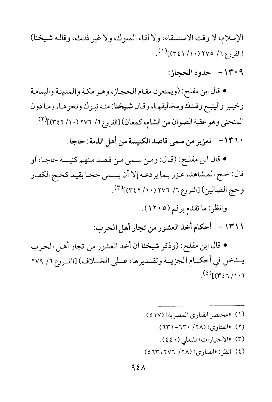 • قال ابن مفلح: (وذكر شيخنا أن أخذ العشور من تجار أهل الحرب يدخل في أحكام الجزية وتقديرها، على الخلاف) [الفروع 6/ 279 (10/ 346)] (¬4).