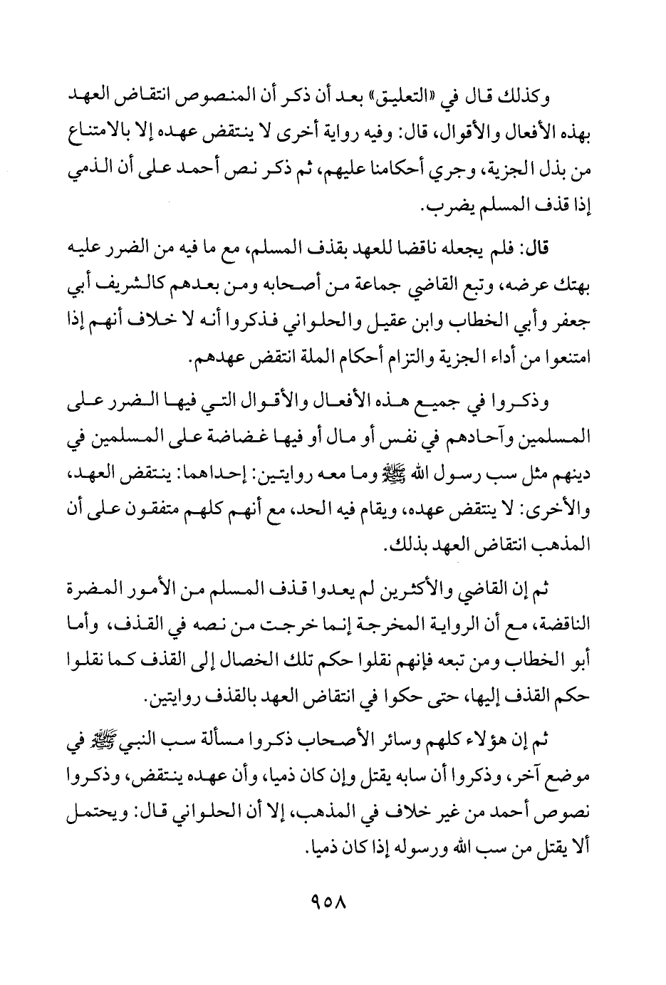 قال: فلم يجعله ناقضا للعهد بقذف المسلم، مع ما فيه من الضرر عليه بهتك عرضه، وتبع القاضي جماعة من أصحابه ومن بعدهم كالشريف أبي جعفر وأبي الخطاب وابن عقيل والحلواني فذكروا أنه لا خلاف أنهم إذا امتنعوا من أداء الجزية والتزام أحكام الملة انتقض عهدهم.