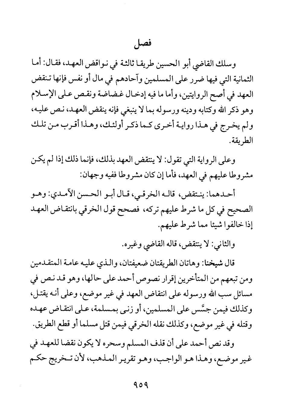 قال شيخنا: وهاتان الطريقتان ضعيفتان، والذي عليه عامة المتقدمين ومن تبعهم من المتأخرين إقرار نصوص أحمد على حالها، وهو قد نص في مسائل سب الله ورسوله على انتقاض العهد في غير موضع، وعلى أنه يقتل، وكذلك فيمن جسَّس على المسلمين، أو زنى بمسلمة، على انتقاض عهده وقتله في غير موضع، وكذلك نقله الخرقي فيمن قتل مسلما أو قطع الطريق.