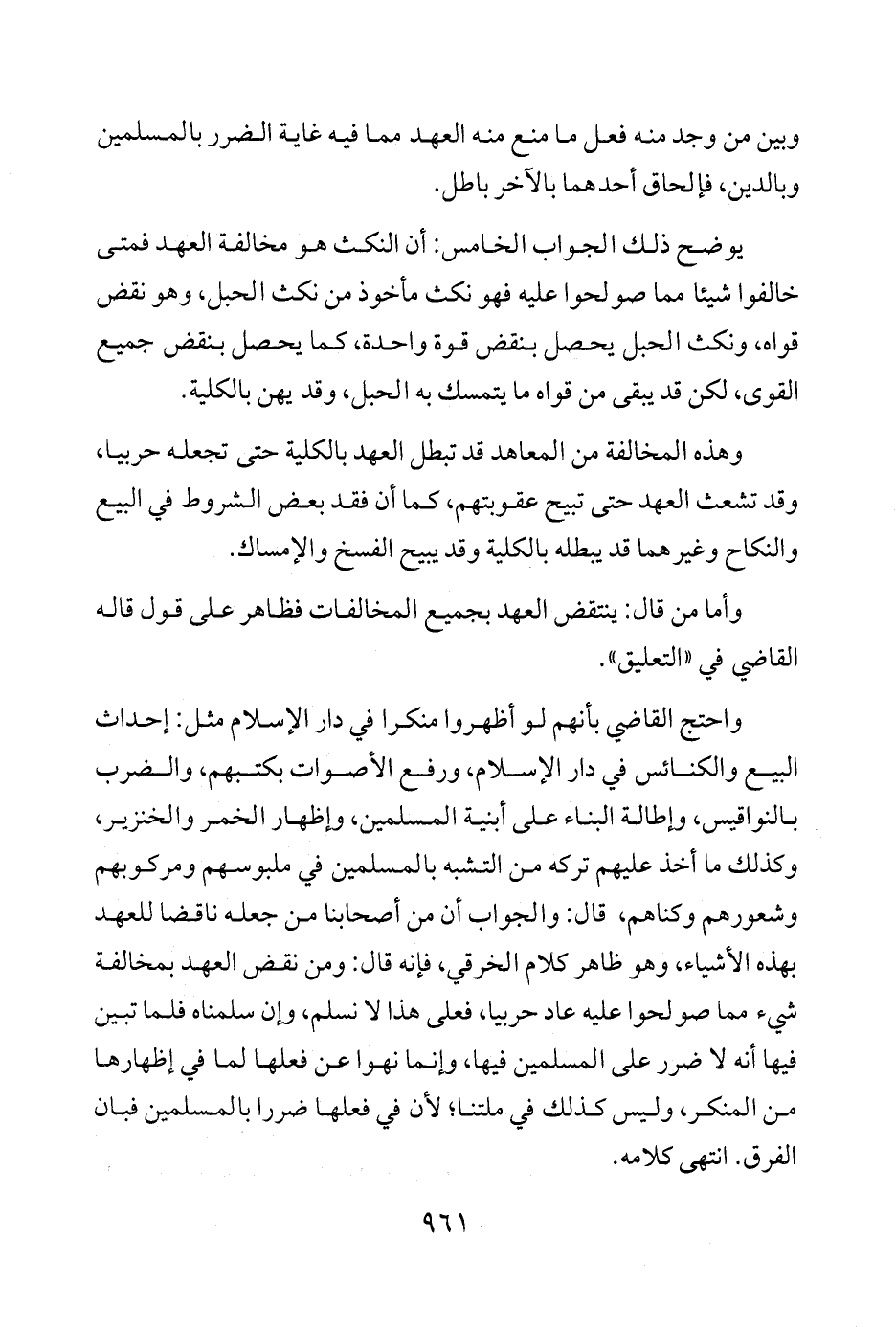 واحتج القاضي بأنهم لو أظهروا منكرا في دار الإسلام مثل: إحداث البيع والكنائس في دار الإسلام، ورفع الأصوات بكتبهم، والضرب بالنواقيس، وإطالة البناء على أبنية المسلمين، وإظهار الخمر والخنزير، وكذلك ما أخذ عليهم تركه من التشبه بالمسلمين في ملبوسهم ومركوبهم وشعورهم وكناهم، قال: والجواب أن من أصحابنا من جعله ناقضا للعهد بهذه الأشياء، وهو ظاهر كلام الخرقي، فإنه قال: ومن نقض العهد بمخالفة شيء مما صولحوا عليه عاد حربيا، فعلى هذا لا نسلم، وإن سلمناه فلما تبين فيها أنه لا ضرر على المسلمين فيها، وإنما نهوا عن فعلها لما في إظهارها من المنكر، وليس كذلك في ملتنا؛ لأن في فعلها ضررا بالمسلمين فبان الفرق. انتهى كلامه.