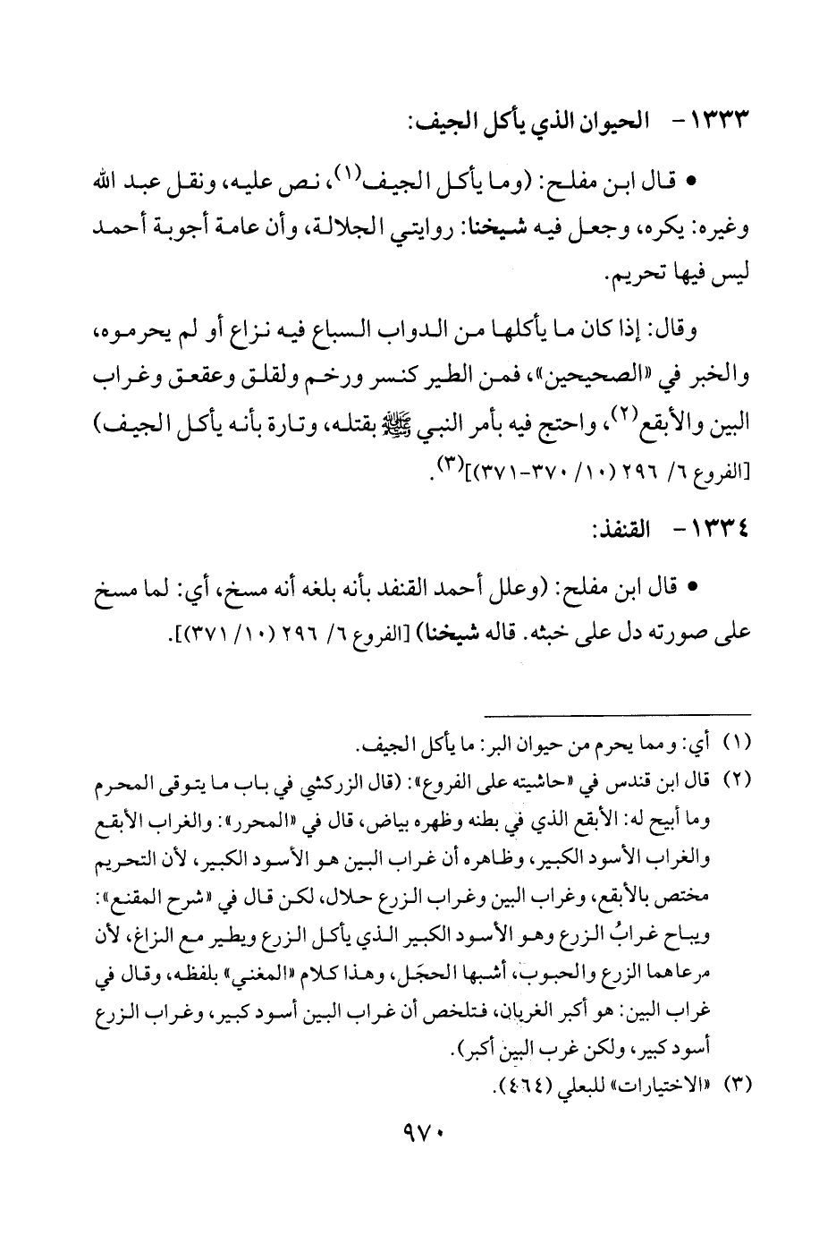 وقال: إذا كان ما يأكلها من الدواب السباع فيه نزاع أو لم يحرموه، والخبر في "الصحيحين"، فمن الطير كنسر ورخم ولقلق وعقعق وغراب البين والأبقع (¬2)، واحتج فيه بأمر النبي - صلى الله عليه وسلم - بقتله، وتارة بأنه يأكل الجيف) [الفروع 6/ 296 (10/ 370 - 371)] (¬3).