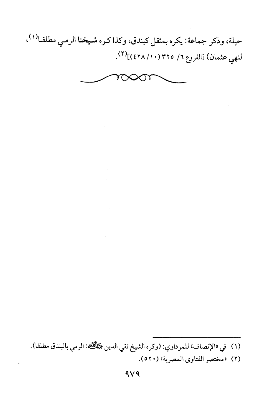 حيلة، وذكر جماعة: يكره بمثقل كبندق، وكذا كره شيخنا الرمي مطلقا (¬1)، لنهي عثمان) [الفروع 6/ 325 (10/ 428)] (¬2).