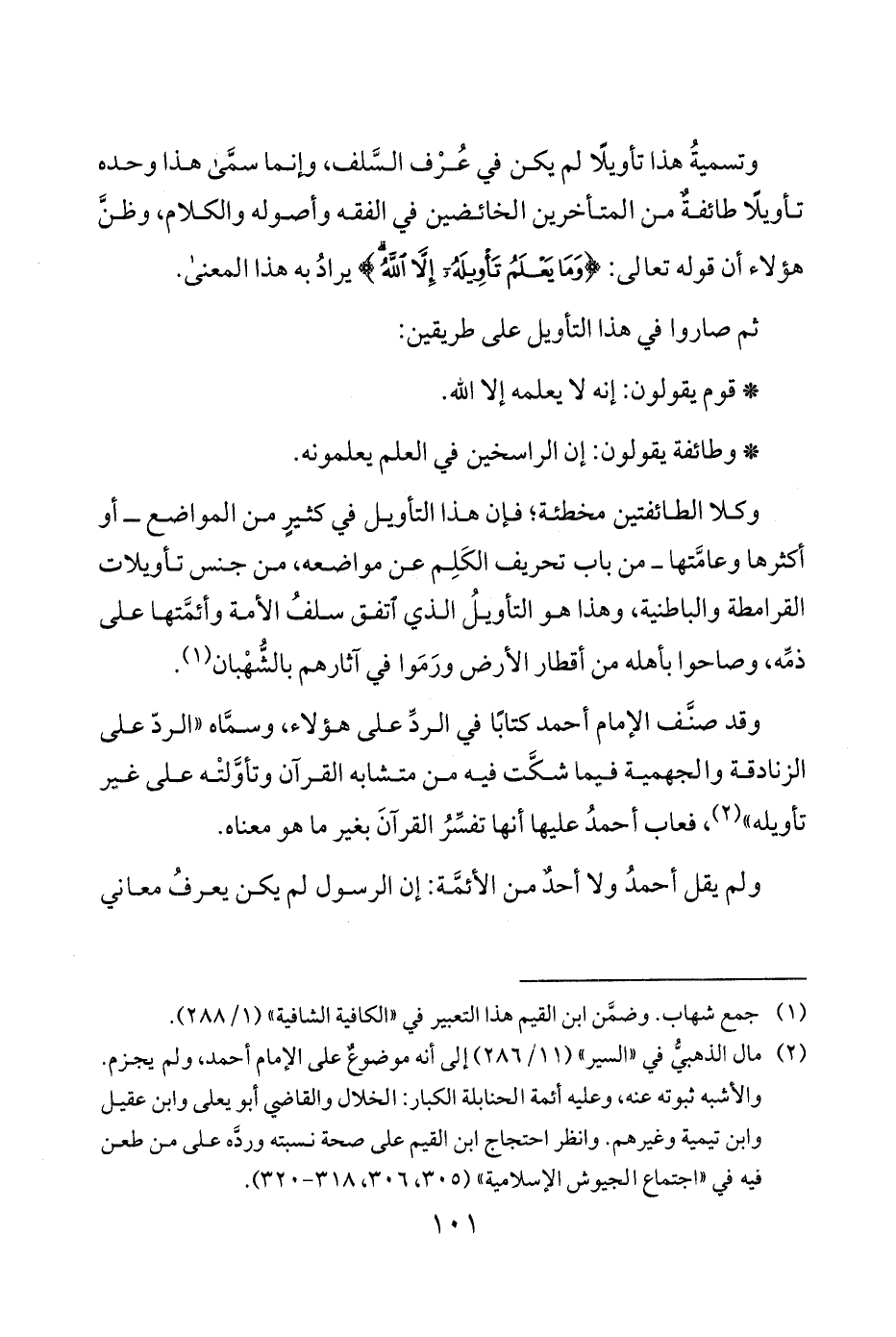 وتسميةُ هذا تأويلًا لم يكن في عُرف السَّلف وإنما سمَّى هذا وحده تأويلًا طائفةٌ من المتأخرين الخائضين في الفقه وأصوله والكلام وظنَّ هؤلاء أن قوله تعالى {وَمَا يَعْلَمُ تَأْوِيلَهُ إِلَّا اللهُ} يرادُ به هذا المعنى.