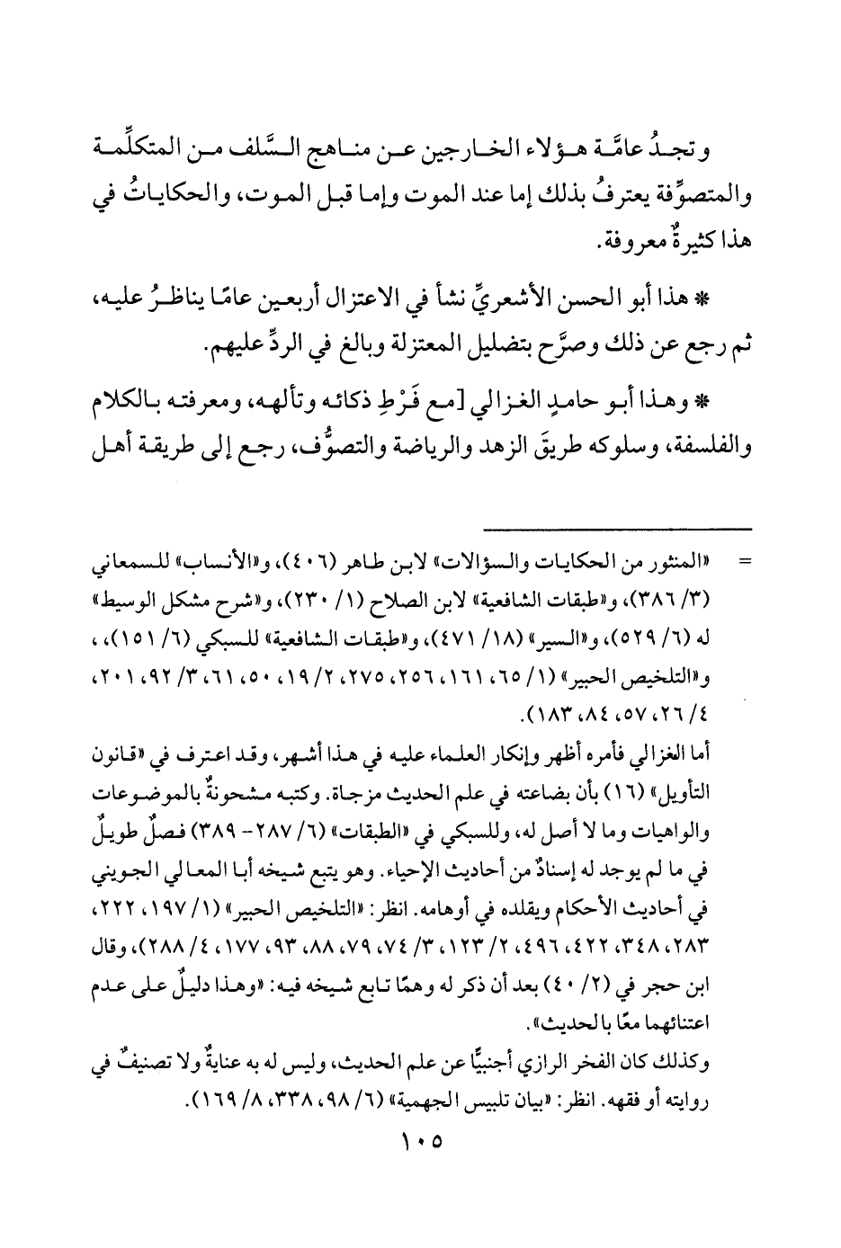 وتجدُ عامَّة هؤلاء الخارجين عن منهاج السَّلف من المتكلِّمة والمتصوِّفة يعترفُ بذلك إما عند الموت وإما قبل الموت والحكاياتُ في هذا كثيرةٌ معروفة.