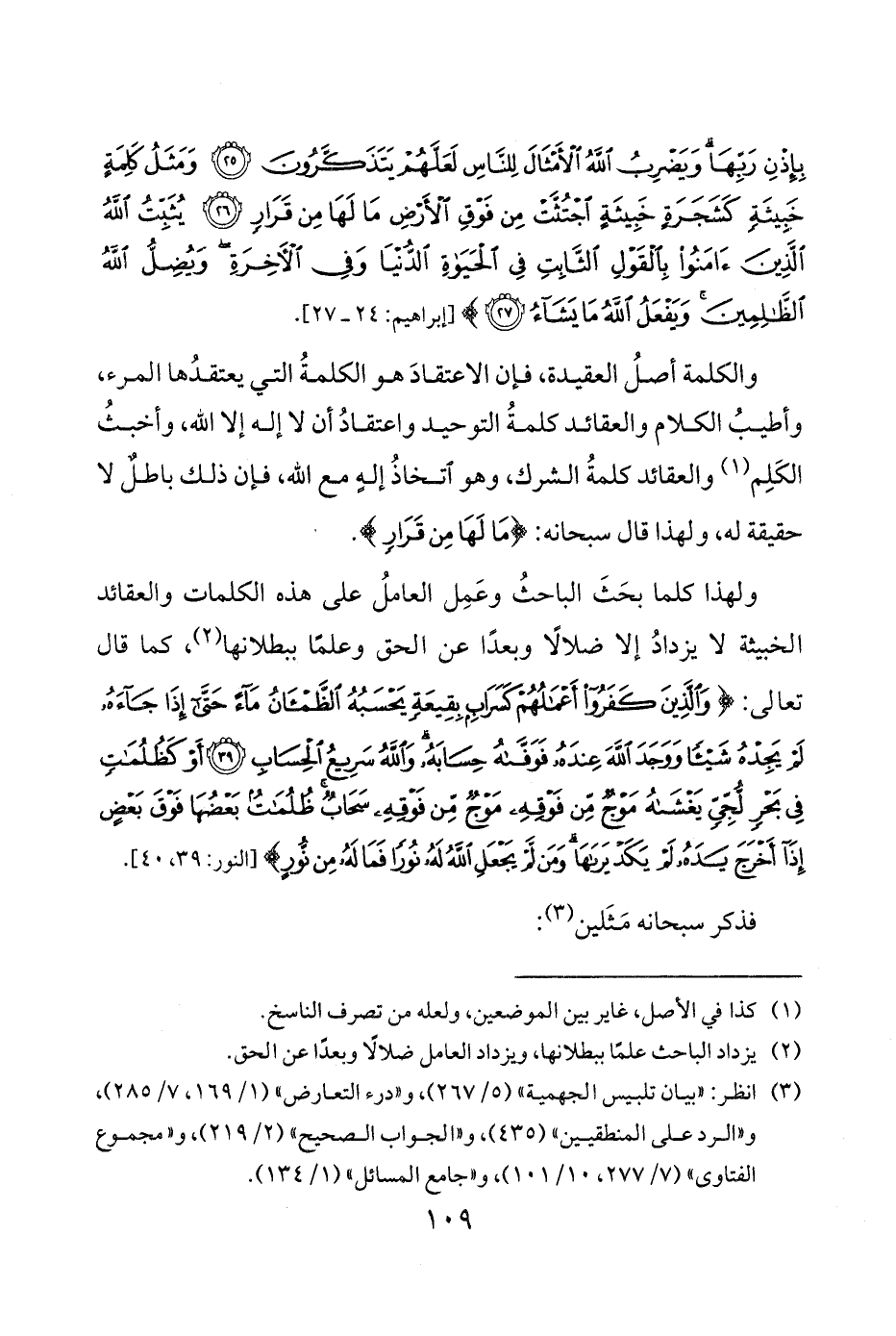 ولهذا كلما بحَثَ الباحثُ وعَمِل العاملُ على هذه الكلمات والعقائد الخبيثة لا يزدادُ إلا ضلالًا وبعدًا عن الحق وعلمًا ببطلانها 2 كما قال تعالى {وَالَّذِينَ كَفَرُوا أَعْمَالُهُمْ كَسَرَابٍ بِقِيعَةٍ يَحْسَبُهُ الظَّمْآنُ مَاءً حَتَّى إِذَا جَاءَهُ لَمْ يَجِدْهُ شَيْئًا وَوَجَدَ اللهَ عِنْدَهُ فَوَفَّاهُ حِسَابَهُ وَاللهُ سَرِيعُ الْحِسَابِ • أَوْ كَظُلُمَاتٍ فِي بَحْرٍ لُجِّيٍّ يَغْشَاهُ مَوْجٌ مِنْ فَوْقِهِ مَوْجٌ مِنْ فَوْقِهِ سَحَابٌ ظُلُمَاتٌ بَعْضُهَا فَوْقَ بَعْضٍ إِذَا أَخْرَجَ يَدَهُ لَمْ يَكَدْ يَرَاهَا وَمَنْ لَمْ يَجْعَلِ اللهُ لَهُ نُورًا فَمَا لَهُ مِنْ نُورٍ}.