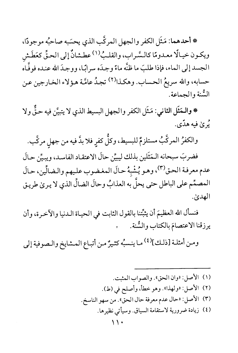 * أحدهما مَثَل الكفر والجهل المركَّب الذي يحسَبه صاحبُه موجودًا ويكون خيالًا معدومًا كالسَّراب والقلبُ 1 عطشانٌ إلى الحقِّ كعَطَشِ الجسد إلى الماء فإذا طلبَ ما ظنَّه ماءً وجدَه سرابًا ووجدَ الله عنده فوفَّاه حسابه والله سريعُ الحساب وهكذا 2 تجدُ عامَّة هؤلاء الخارجين عن السُّنة والجماعة.