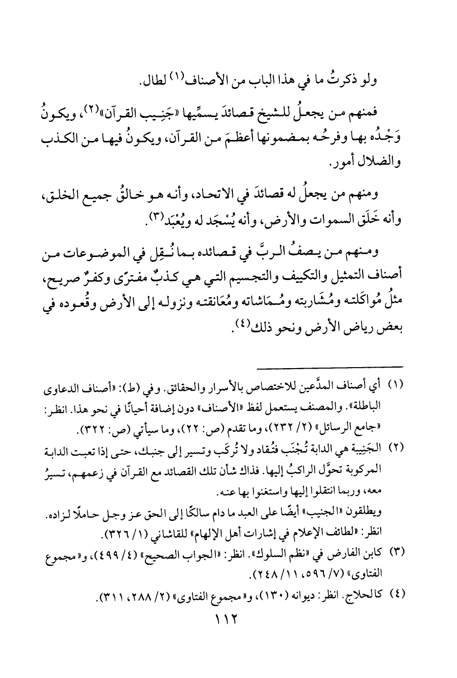 فمنهم من يجعلُ للشيخ قصائدَ يسمِّيها جَنِيب القرآن 2 ويكونُ وَجْدُه بها وفرحُه بمضمونها أعظمَ من القرآن ويكونُ فيها من الكذب والضلال أمور.