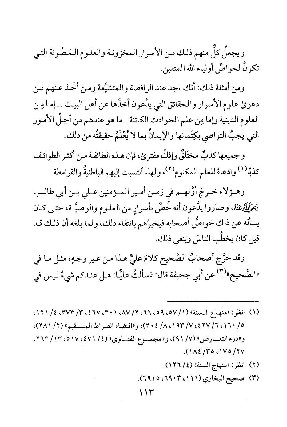 وهؤلاء خرجَ أوَّلهم في زمن أمير المؤمنين علي بن أبي طالب رضي الله عنه وصاروا يدَّعون أنه خُصَّ بأسرارٍ من العلوم والوصيَّة حتى كان يسأله عن ذلك خواصُّ أصحابه فيخبُرهم بانتفاء ذلك ولما بلغه أن ذلك قد قيل كان يخطبُ الناسَ وينفي ذلك.