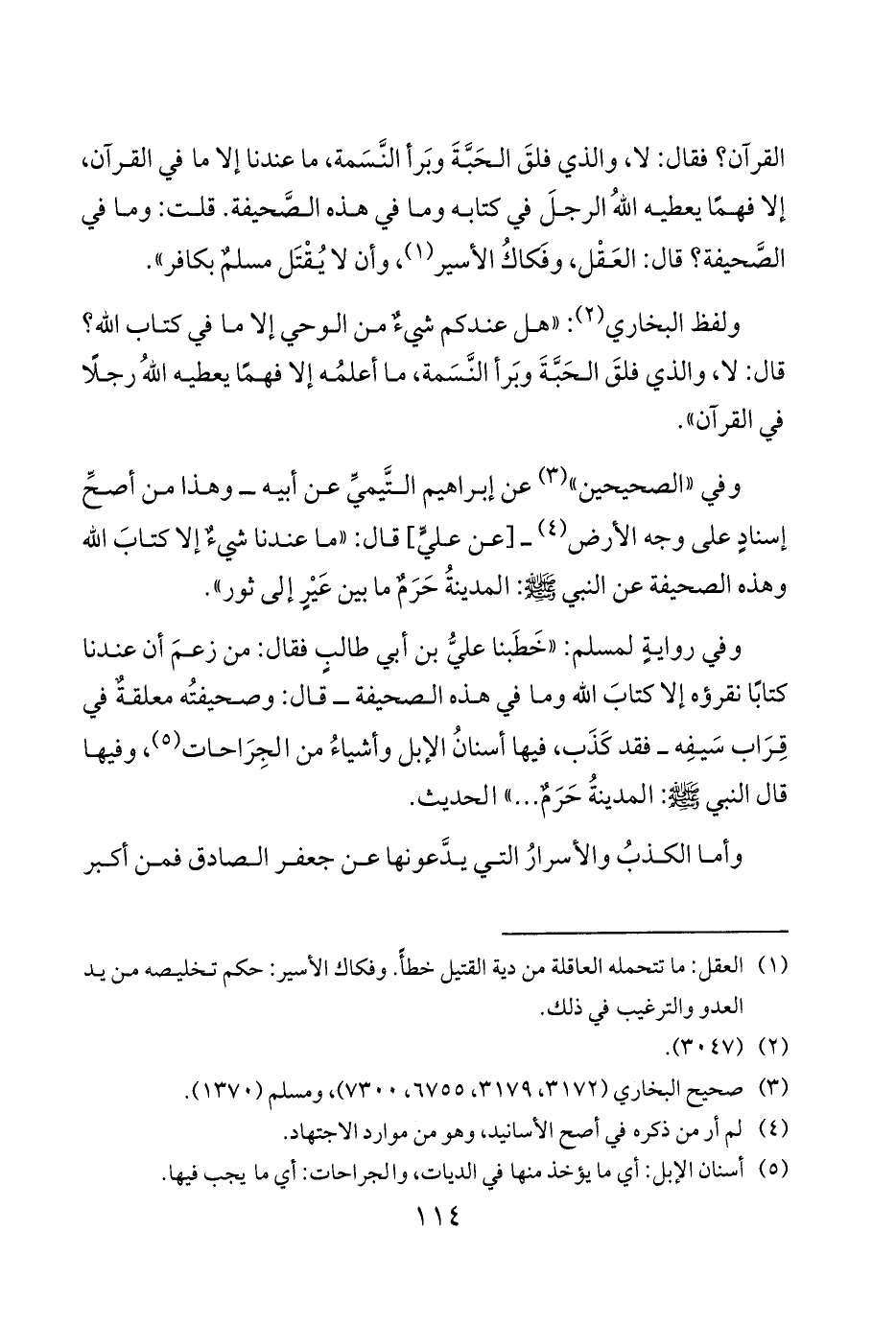 القرآن فقال لا والذي فلقَ الحَبَّةَ وبَرأ النَّسَمة ما عندنا إلا ما في القرآن إلا فهمًا يعطيه اللهُ الرجلَ في كتابه وما في هذه الصَّحيفة قلت وما في الصَّحيفة قال العَقْل وفَكاكُ الأسير 1 وأن لا يُقْتَل مسلمٌ بكافر».
