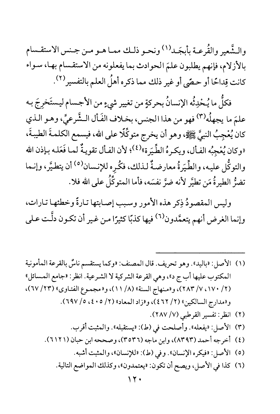 فكلُّ ما يُحْدِثُه الإنسانُ بحركةٍ من تغيير شيءٍ من الأجسام ليستَخرِجَ به علمَ ما يجهلُه 3 فهو من هذا الجنس بخلاف الفَأل الشَّرعيِّ وهو الذي كان يُعْجِبُ النبيَّ صلى الله عليه وسلم وهو أن يخرج متوكِّلًا على الله فيسمع الكلمةَ الطيبةَ «وكان يُعْجِبُه الفأل ويكرهُ الطِّيَرة» 4 لأن الفأل تقويةٌ لما فَعَله بإذن الله والتوكُّل عليه والطِّيَرةُ معارضةٌ لذلك فكُرِه للإنسان 5 أن يتطيَّر وإنما تضرُّ الطيرةُ مَن تطيَّر لأنه ضرَّ نفسَه فأما المتوكِّلُ على الله فلا.