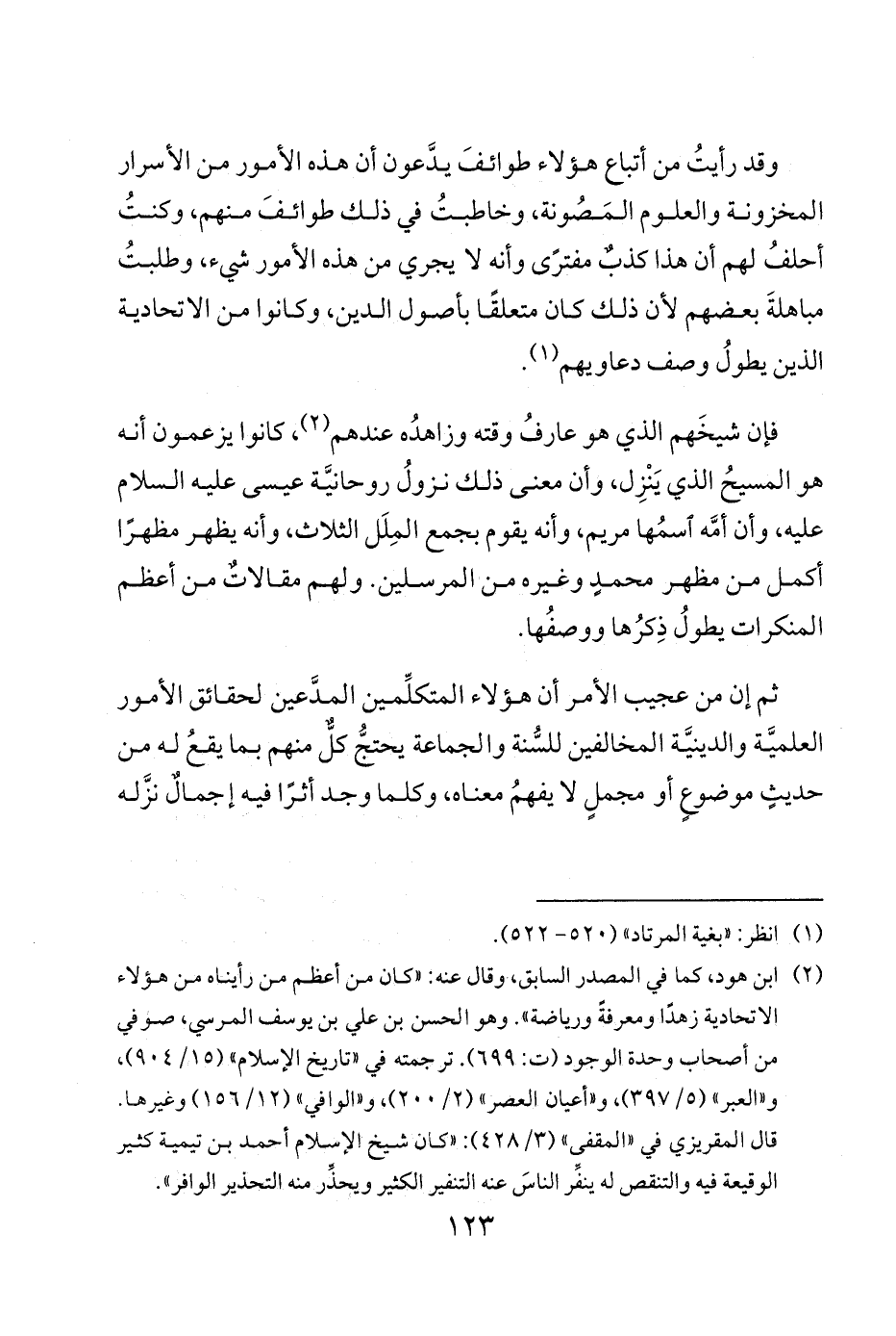 وقد رأيتُ من أتباع هؤلاء طوائفَ يدَّعون أن هذه الأمور من الأسرار المخزونة والعلوم المَصُونة وخاطبتُ في ذلك طوائفَ منهم وكنتُ أحلفُ لهم أن هذا كذبٌ مفترًى وأنه لا يجري من هذه الأمور شيء وطلبتُ مباهلةَ بعضهم لأن ذلك كان متعلقًا بأصول الدين وكانوا من الاتحادية الذين يطولُ وصف دعاويهم 1.