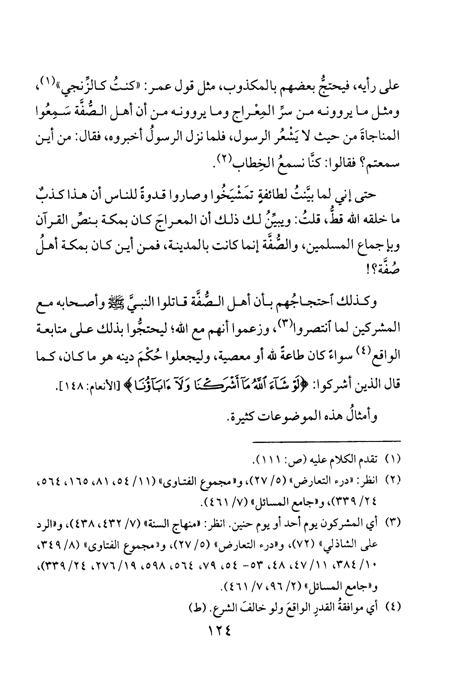 وكذلك احتجاجُهم بأن أهل الصُّفَّة قاتلوا النبيَّ صلى الله عليه وسلم وأصحابه مع المشركين لما انتصروا 3 وزعموا أنهم مع الله ليحتجُّوا بذلك على متابعة الواقع 4 سواءً كان طاعةً لله أو معصية وليجعلوا حُكْمَ دينه هو ما كان كما قال الذين أشركوا {لَوْ شَاءَ اللهُ مَا أَشْرَكْنَا وَلَا آبَاؤُنَا}.