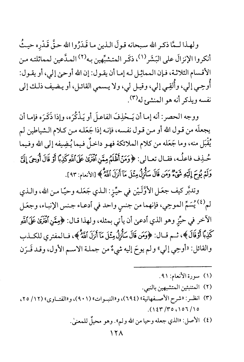 ولهذا لمَّا ذكر الله سبحانه قولَ الذين ما قَدَرُوا الله حقَّ قَدْرِه حيثُ أنكروا الإنزالَ على البَشَر 1 ذكَر المتشبِّهين به 2 المدَّعين لمماثلته من الأقسام الثلاثة فإن المماثِل له إما أن يقول إن الله أوحى إلي أو يقول أُوحِي إلي وأُلقِي إلي وقيل لي ولا يسمي القائل أو يضيف ذلك إلى نفسه ويذكر أنه هو المنشئ له 3.