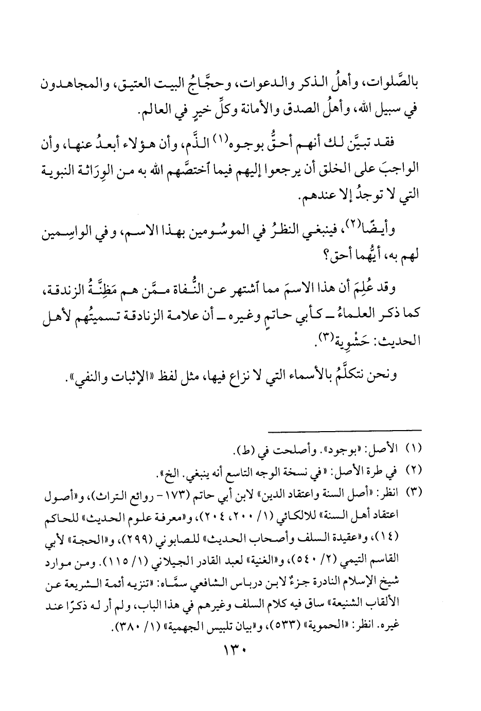 وقد عُلِمَ أن هذا الاسمَ مما اشتهر عن النُّفاة ممَّن هم مَظِنَّةُ الزندقة كما ذكر العلماءُ كأبي حاتمٍ وغيره أن علامة الزنادقة تسميتُهم لأهل الحديث حَشْوِية 3.