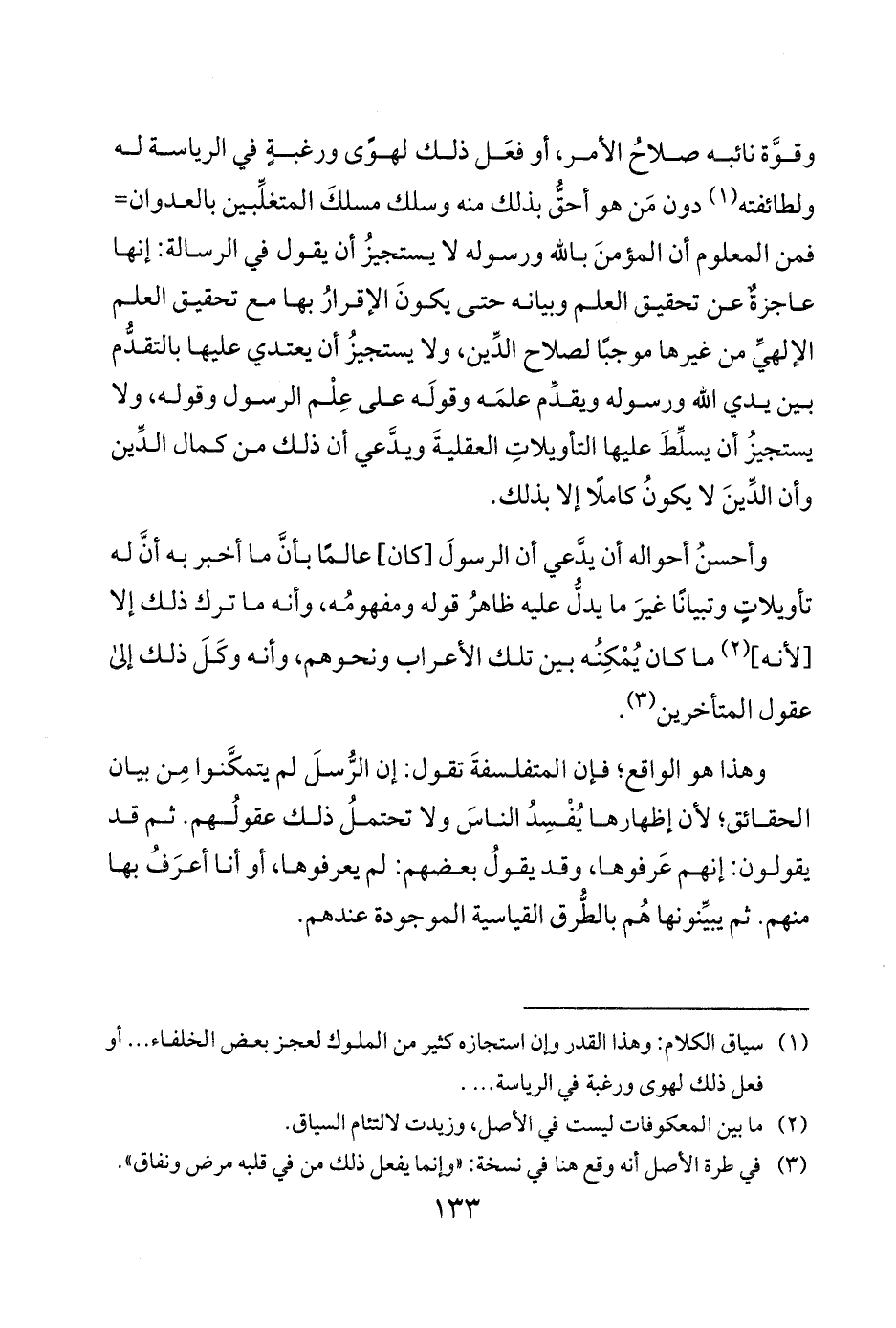 وقوَّة نائبه صلاحُ الأمر أو فعَل ذلك لهوًى ورغبةٍ في الرياسة له ولطائفته 1 دون مَن هو أحقُّ بذلك منه وسلك مسلكَ المتغلِّبين بالعدوان فمن المعلوم أن المؤمنَ بالله ورسوله لا يستجيزُ أن يقول في الرسالة إنها عاجزةٌ عن تحقيق العلم وبيانه حتى يكونَ الإقرارُ بها مع تحقيق العلم الإلهيِّ من غيرها موجبًا لصلاح الدِّين ولا يستجيزُ أن يعتدي عليها بالتقدُّم بين يدي الله ورسوله ويقدِّم علمَه وقولَه على عِلْم الرسول وقوله ولا يستجيزُ أن يسلِّطَ عليها التأويلاتِ العقليةَ ويدَّعي أن ذلك من كمال الدِّين وأن الدِّينَ لا يكونُ كاملًا إلا بذلك.