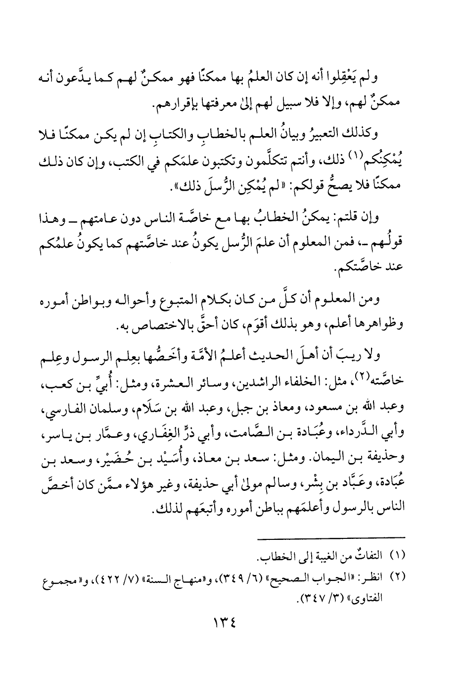 ولا ريبَ أن أهلَ الحديث أعلمُ الأمة وأخَصُّها بعِلم الرسول وعِلم خاصَّته 2 مثل الخلفاء الراشدين وسائر العشرة ومثل أُبيِّ بن كعب وعبد الله بن مسعود ومعاذ بن جبل وعبد الله بن سَلَام وسلمان الفارسي وأبي الدَّرداء وعُبادة بن الصَّامت وأبي ذرٍّ الغِفَاري وعمَّار بن ياسر وحذيفة بن اليمان ومثل سعد بن معاذ وأُسَيْد بن حُضَيْر وسعد بن عُبَادة وعَبَّاد بن بِشْر وسالم مولى أبي حذيفة وغير هؤلاء ممَّن كان أخصَّ الناس بالرسول وأعلمَهم بباطن أموره وأتبعَهم لذلك.