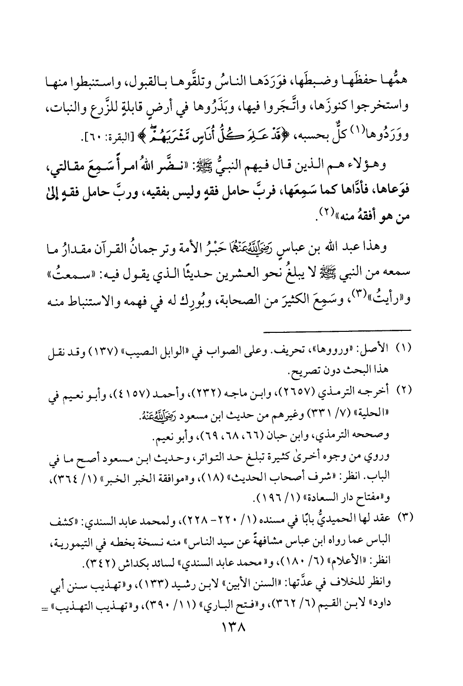 وهؤلاء هم الذين قال فيهم النبيُّ صلى الله عليه وسلم «نضَّر اللهُ امرأً سَمِعَ مقالتي فوَعاها فأدَّاها كما سَمِعَها فربَّ حامل فقهٍ وليس بفقيه وربَّ حامل فقهٍ إلى من هو أفقهُ منه» 2.