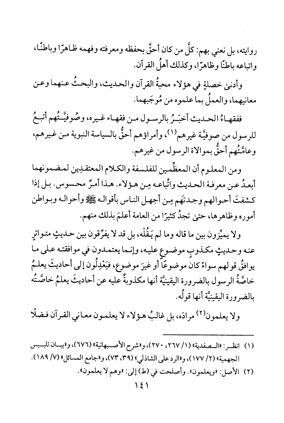ومن المعلوم أن المعظِّمين للفلسفة والكلام المعتقدِين لمضمونهما أبعدُ عن معرفة الحديث واتِّباعه مِن هؤلاء هذا أمرٌ محسوس بل إذا كشفتَ أحوالهم وجدتَهم مِن أجهل الناس بأقواله صلى الله عليه وسلم وأحواله وبواطن أموره وظواهرها حتى لتجدُ كثيرًا من العامة أعلمَ بذلك منهم.