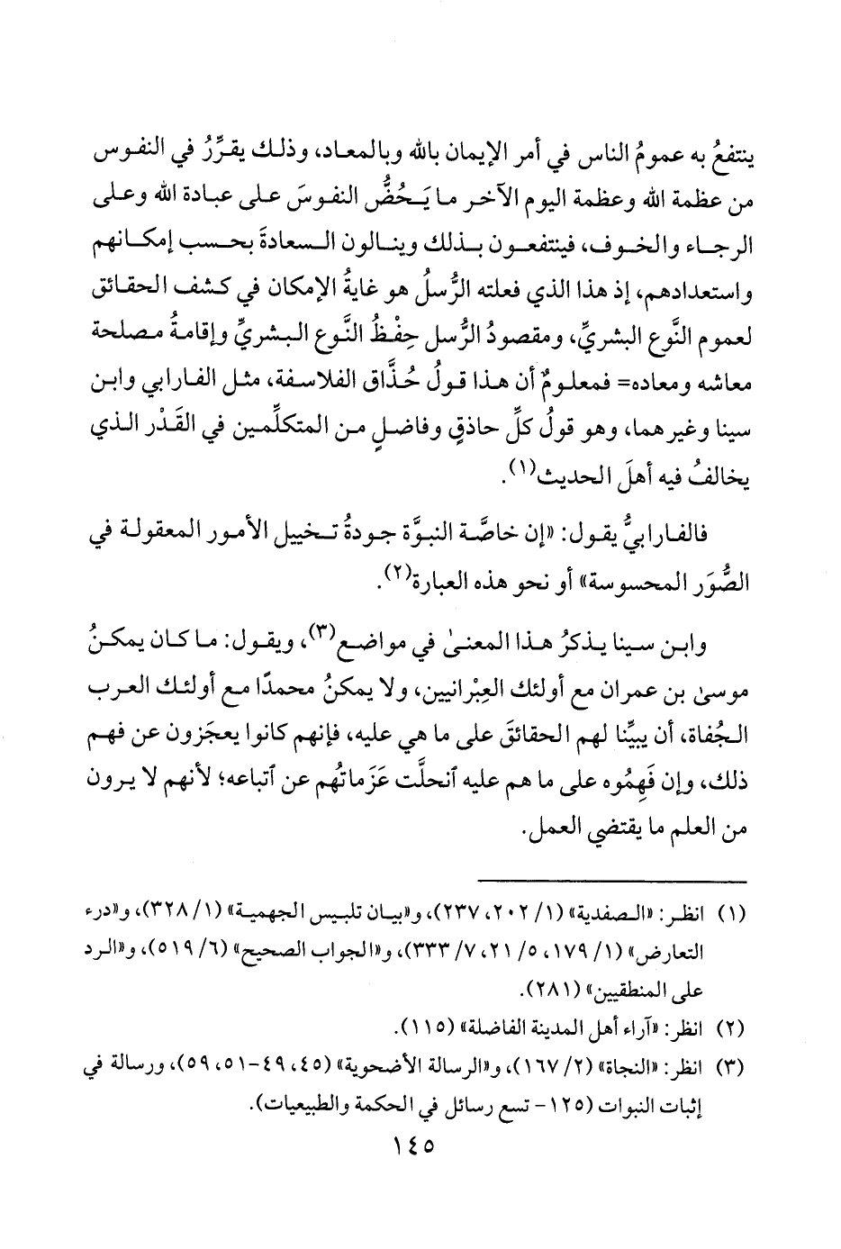 ينتفعُ به عمومُ الناس في أمر الإيمان بالله وبالمعاد وذلك يقرِّرُ في النفوس من عظمة الله وعظمة اليوم الآخر ما يَحُضُّ النفوسَ على عبادة الله وعلى الرجاء والخوف فينتفعون بذلك وينالون السعادةَ بحسب إمكانهم واستعدادهم إذ هذا الذي فعلته الرُّسل هو غايةُ الإمكان في كشف الحقائق لعموم النَّوع البشريِّ ومقصودُ الرُّسل حِفْظُ النَّوع البشريِّ وإقامةُ مصلحة معاشه ومعاده فمعلومٌ أن هذا قولُ حُذَّاق الفلاسفة مثل الفارابي وابن سينا وغيرهما وهو قولُ كلِّ حاذقٍ وفاضلٍ من المتكلِّمين في القَدْر الذي يخالفُ فيه أهلَ الحديث 1.