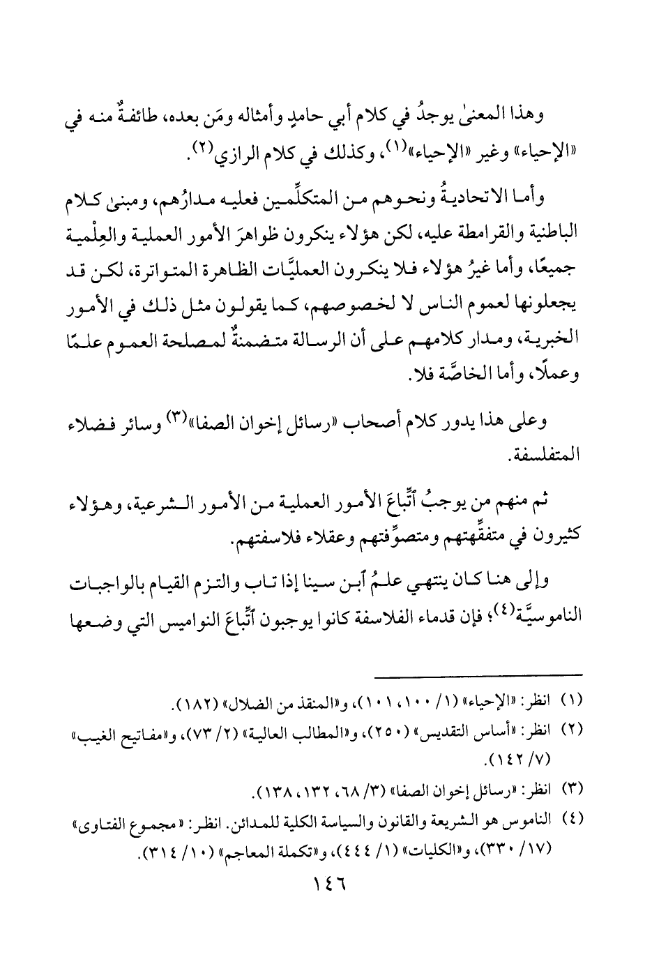 ثم منهم من يوجبُ اتِّباعَ الأمور العملية من الأمور الشرعية وهؤلاء كثيرون في متفقِّهتهم ومتصوِّفتهم وعقلاء فلاسفتهم.