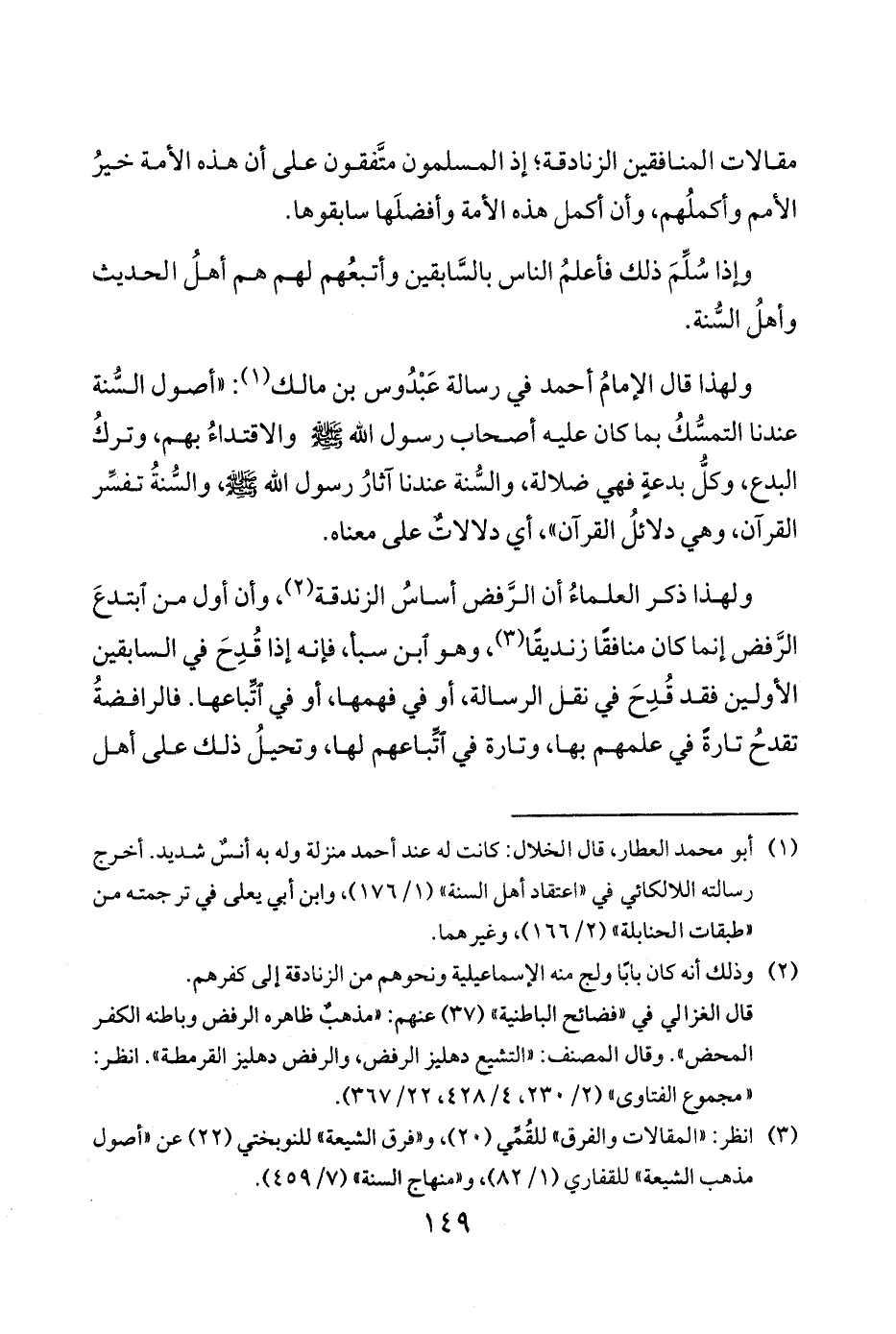 ولهذا ذكر العلماءُ أن الرَّفض أساسُ الزندقة 2 وأن أول من ابتدعَ الرَّفض إنما كان منافقًا زنديقًا 3 وهو ابن سبأ فإنه إذا قُدِحَ في السابقين الأولين فقد قُدِحَ في نقل الرسالة أو في فهمها أو في اتِّباعها فالرافضةُ تقدحُ تارةً في علمهم بها وتارة في اتِّباعهم لها وتحيلُ ذلك على أهل