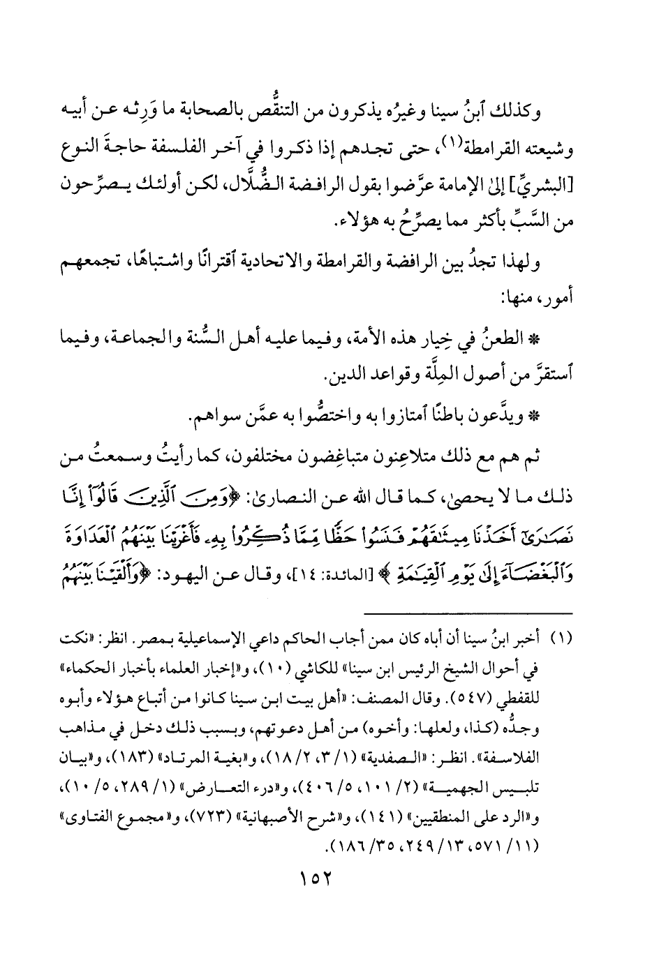 وكذلك ابنُ سينا وغيرُه يذكرون من التنقُّص بالصحابة ما وَرِثه عن أبيه وشيعته القرامطة 1 حتى تجدهم إذا ذكروا في آخر الفلسفة حاجةَ النوع [البشريِّ] إلى الإمامة عرَّضوا بقول الرافضة الضُّلَّال لكن أولئك يصرِّحون من السَّبِّ بأكثر مما يصرِّحُ به هؤلاء.