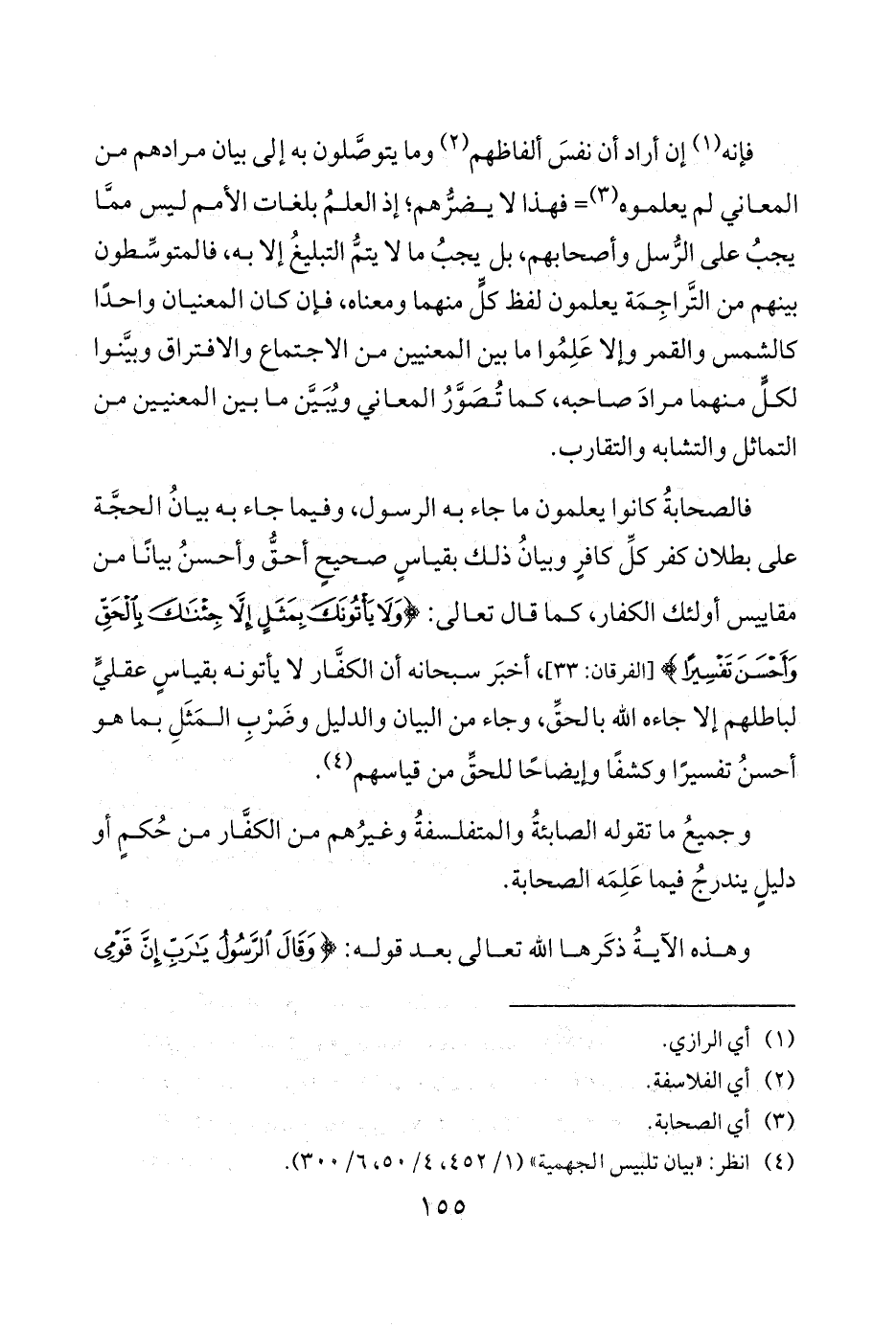 فالصحابةُ كانوا يعلمون ما جاء به الرسول وفيما جاء به بيانُ الحجَّة على بطلان كفر كلِّ كافرٍ وبيانُ ذلك بقياسٍ صحيحٍ أحقُّ وأحسنُ بيانًا من مقاييس أولئك الكفار كما قال تعالى {وَلَا يَأْتُونَكَ بِمَثَلٍ إِلَّا جِئْنَاكَ بِالْحَقِّ وَأَحْسَنَ تَفْسِيرًا} أخبرَ سبحانه أن الكفَّار لا يأتونه بقياسٍ عقليٍّ لباطلهم إلا جاءه الله بالحقِّ وجاء من البيان والدليل وضَرْبِ المَثَلِ بما هو أحسنُ تفسيرًا وكشفًا وإيضاحًا للحقِّ من قياسهم 4.