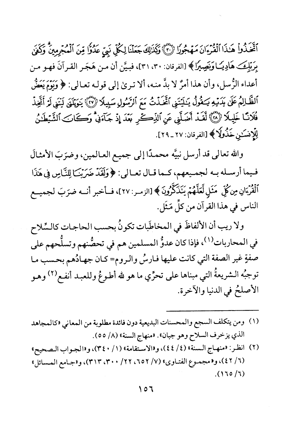 اتَّخَذُوا هَذَا الْقُرْآنَ مَهْجُورًا • وَكَذَلِكَ جَعَلْنَا لِكُلِّ نَبِيٍّ عَدُوًّا مِنَ الْمُجْرِمِينَ وَكَفَى بِرَبِّكَ هَادِيًا وَنَصِيرًا} فبيَّن أن من هَجَر القرآنَ فهو من أعداء الرُّسل وأن هذا أمرٌ لا بدَّ منه ألا ترى إلى قوله تعالى {وَيَوْمَ يَعَضُّ الظَّالِمُ عَلَى يَدَيْهِ يَقُولُ يَالَيْتَنِي اتَّخَذْتُ مَعَ الرَّسُولِ سَبِيلًا • يَاوَيْلَتَا لَيْتَنِي لَمْ أَتَّخِذْ فُلَانًا خَلِيلًا • لَقَدْ أَضَلَّنِي عَنِ الذِّكْرِ بَعْدَ إِذْ جَاءَنِي وَكَانَ الشَّيْطَانُ لِلْإِنْسَانِ خَذُولًا}.