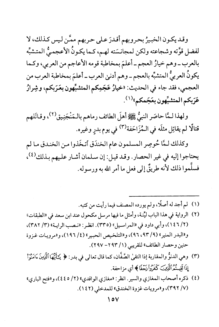 وقد يكون الخبيرُ بحروبهم أقدرَ على حربهم ممَّن ليس كذلك لا لفضل قوَّته وشجاعته ولكن لمجانسَته لهم كما يكونُ الأعجميُّ المتشبِّه بالعرب وهم خيارُ العجم أعلمَ بمخاطبة قومه الأعاجم من العربي وكما يكون العربيُّ المتشبِّه بالعجم وهم أدنى العرب أعلمَ بمخاطبة العرب من العجمي فقد جاء في الحديث «خيارُ عَجَمِكم المتشبِّهون بعَرَبكم وشِرارُ عَرَبكم المتشبِّهون بعَجَمكم» 1.