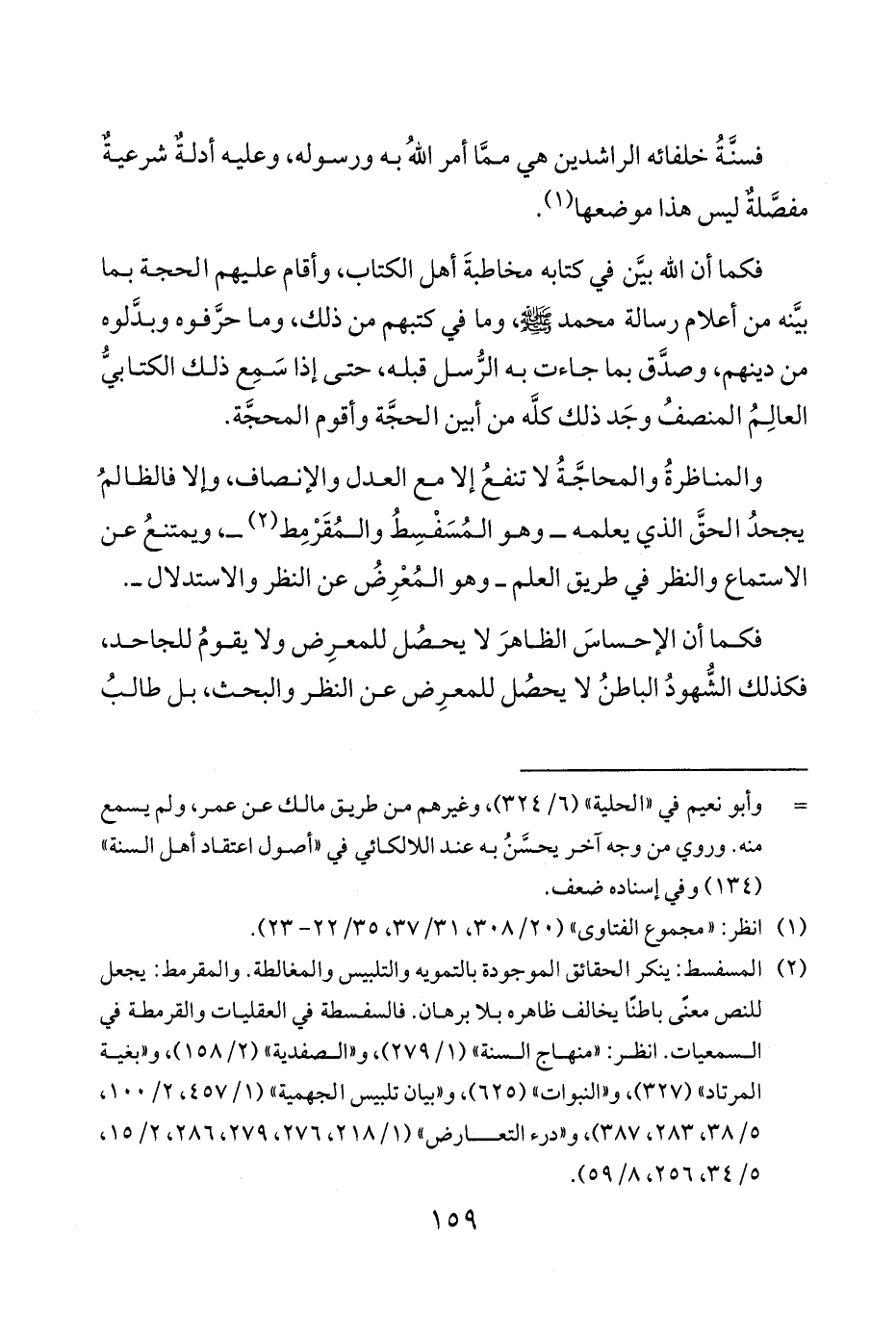 والمناظرةُ والمحاجَّةُ لا تنفعُ إلا مع العدل والإنصاف وإلا فالظالمُ يجحدُ الحقَّ الذي يعلمه وهو المُسَفْسِطُ والمُقَرْمِط 2 ويمتنعُ عن الاستماع والنظر في طريق العلم وهو المُعْرِضُ عن النظر والاستدلال.
