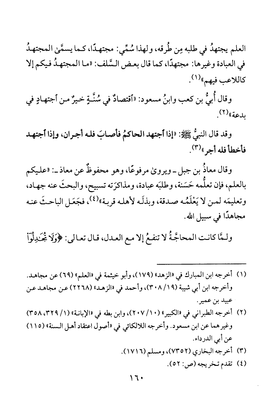 العلم يجتهدُ في طلبه مِن طُرقه ولهذا سُمِّي مجتهدًا كما يسمَّى المجتهدُ في العبادة وغيرها مجتهدًا كما قال بعض السَّلف ما المجتهدُ فيكم إلا كاللاعب فيهم 1.