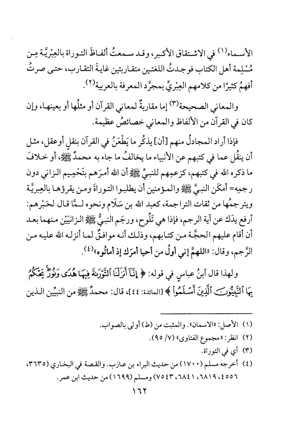 فإذا أراد المجادلُ منهم [أن] يذكُر ما يَطْعَنُ في القرآن بنقلٍ أو عقل مثل أن ينقُل عما في كتبهم عن الأنبياء ما يخالفُ ما جاء به محمدٌ صلى الله عليه وسلم أو خلافَ ما ذكره الله في كتبهم كزعمِهم للنبيِّ صلى الله عليه وسلم أن الله أمرَهم بتَحْمِيم الزاني دون رجمِه أمكَن النبيَّ صلى الله عليه وسلم والمؤمنين أن يطلبوا التوراةَ ومن يقرؤها بالعِبريَّة ويترجُمها من ثقات التراجمة كعبد الله بن سَلَام ونحوه لمَّا قال لحَبْرهم ارفع يدَك عن آية الرجم فإذا هي تَلُوح ورجَم النبيُّ صلى الله عليه وسلم الزانيَيْن منهما بعد أن أقام عليهم الحجَّة من كتابهم وذلك أنه موافقٌ لما أنزله الله عليه من الرَّجم وقال «اللهمَّ إني أولُ من أحيا أمرَك إذ أماتُوه» 4.