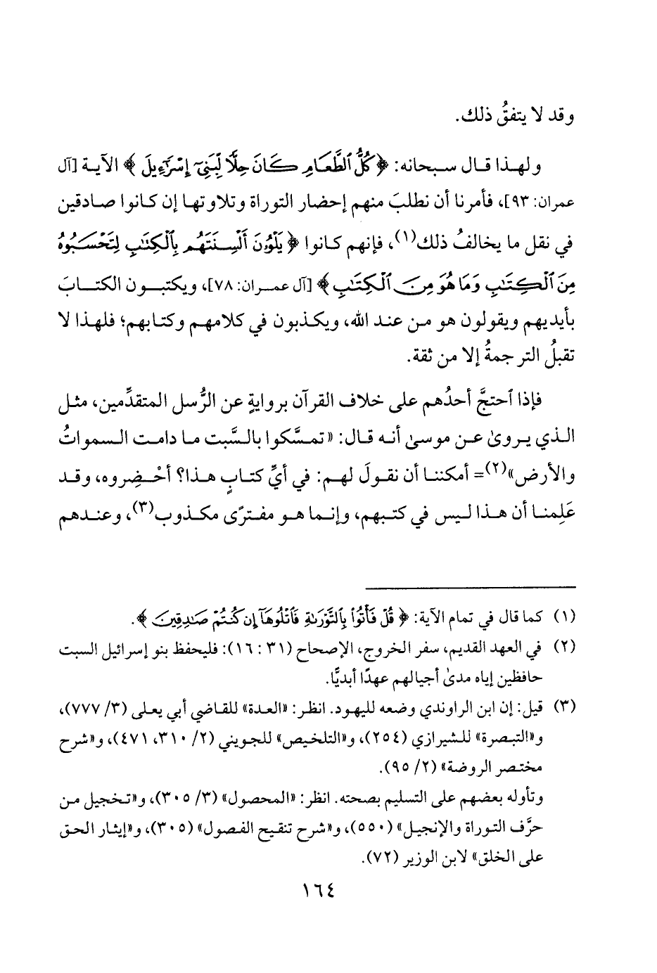 ولهذا قال سبحانه {كُلُّ الطَّعَامِ كَانَ حِلًّا لِبَنِي إِسْرَائِيلَ} الآية فأمرنا أن نطلبَ منهم إحضار التوراة وتلاوتها إن كانوا صادقين في نقل ما يخالفُ ذلك 1 فإنهم كانوا {يَلْوُونَ أَلْسِنَتَهُمْ بِالْكِتَابِ لِتَحْسَبُوهُ مِنَ الْكِتَابِ وَمَا هُوَ مِنَ الْكِتَابِ} ويكتبون الكتابَ بأيديهم ويقولون هذا من عند الله ويكذبون في كلامهم وكتابهم فلهذا لا تقبلُ الترجمةُ إلا من ثقة.