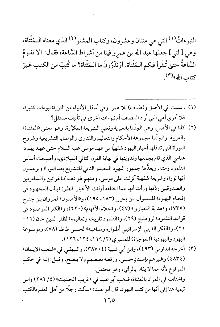 النبوءاتُ 1 التي هي مئتان وعشرون وكتاب المشنو 2 الذي معناه المَثْناة وهي [التي] جعلها عبد الله بن عمرٍو فينا من أشراط السَّاعة فقال لا تقومُ السَّاعةُ حتى تُقْرأ فيكم المَثْناة أوَتَدْرُونَ ما المَثْناة ما كُتِبَ من الكتب غيرَ كتاب الله 3.