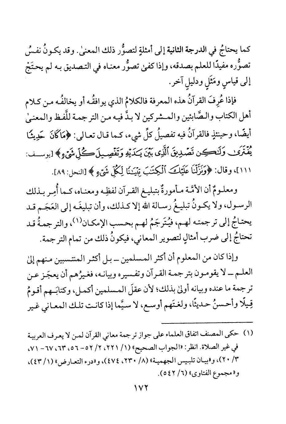 ومعلومٌ أن الأمَّة مأمورةٌ بتبليغ القرآن لفظِه ومعناه كما أُمِر بذلك الرسول ولا يكونُ تبليغُ رسالة الله إلا كذلك وأن تبليغَه إلى العَجَم قد يحتاجُ إلى ترجمته لهم فيُتَرجَمُ لهم بحسب الإمكان 1 والترجمةُ قد تحتاجُ إلى ضرب أمثالٍ لتصوير المعاني فيكونُ ذلك من تمام الترجمة.
