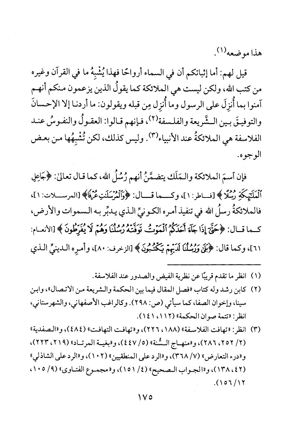 قيل لهم أما إثباتكم أن في السماء أرواحًا فهذا يُشْبِهُ ما في القرآن وغيره من كتب الله ولكن ليست هي الملائكة كما يقولُ الذين يزعمون منكم أنهم آمنوا بما أُنزِلَ على الرسول وما أُنزِل مِن قبله ويقولون ما أردنا إلا الإحسانَ والتوفيقَ بين الشَّريعة والفلسفة 2 فإنهم قالوا العقولُ والنفوسُ عند الفلاسفة هي الملائكة عند الأنبياء 3 وليس كذلك لكن تُشْبِهُها من بعض الوجوه.