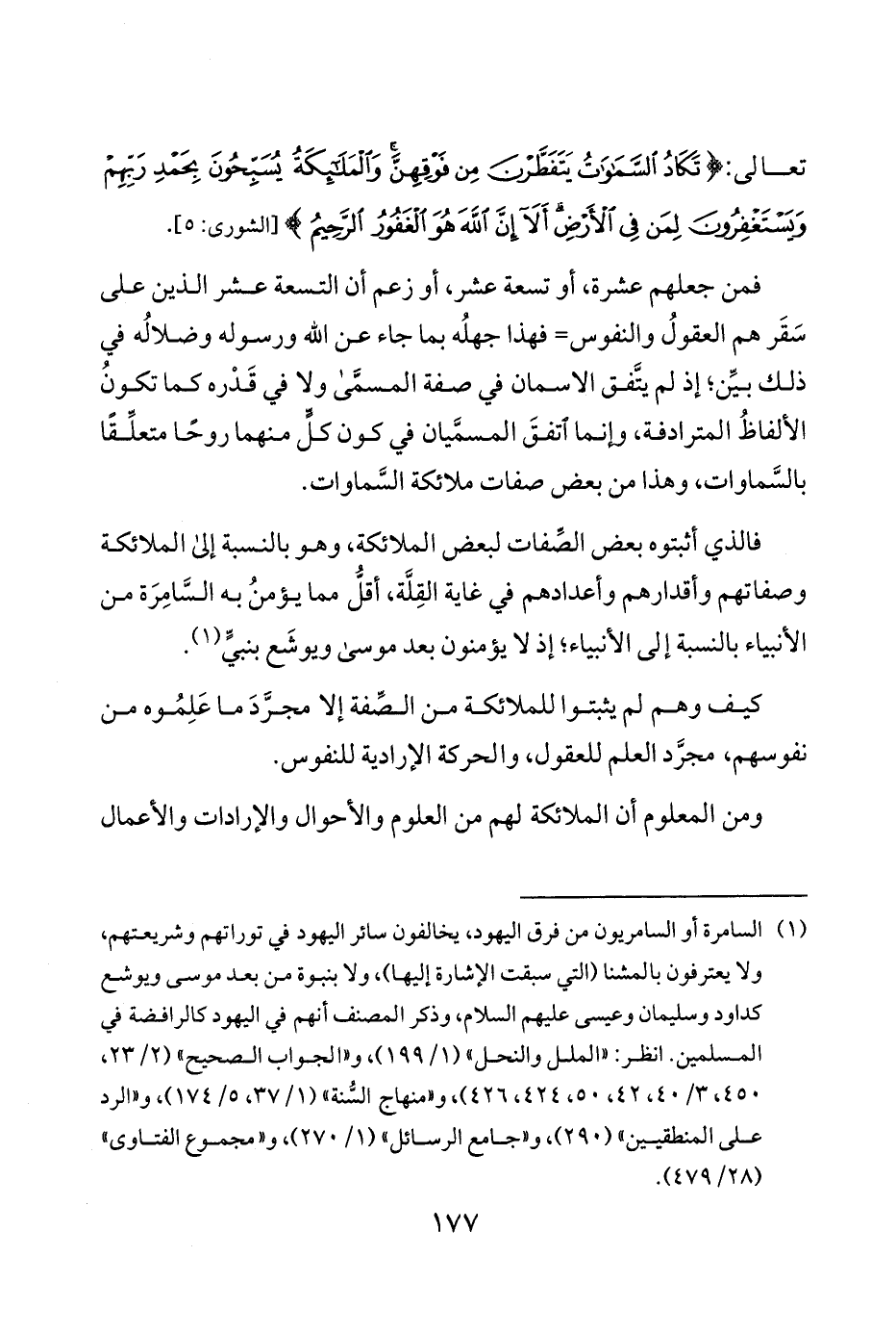 فالذي أثبتوه بعض الصِّفات لبعض الملائكة وهو بالنسبة إلى الملائكة وصفاتهم وأقدارهم وأعدادهم في غاية القِلَّة أقلُّ مما يؤمنُ به السَّامِرَة من الأنبياء بالنسبة إلى الأنبياء إذ لا يؤمنون بعد موسى ويوشَع بنبيٍّ 1.