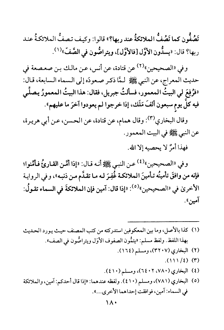 وفي الصحيحين 2 عن قتادة عن أنس عن مالك بن صعصعة في حديث المعراج عن النبي صلى الله عليه وسلم لمَّا ذكر صعودَه إلى السماء السابعة قال «فرُفِعَ لي البيتُ المعمور فسألتُ جبريل فقال هذا البيتُ المعمورُ يصلِّي فيه كلَّ يومٍ سبعون ألفَ مَلَك إذا خرجوا لم يعودوا آخرَ ما عليهم».