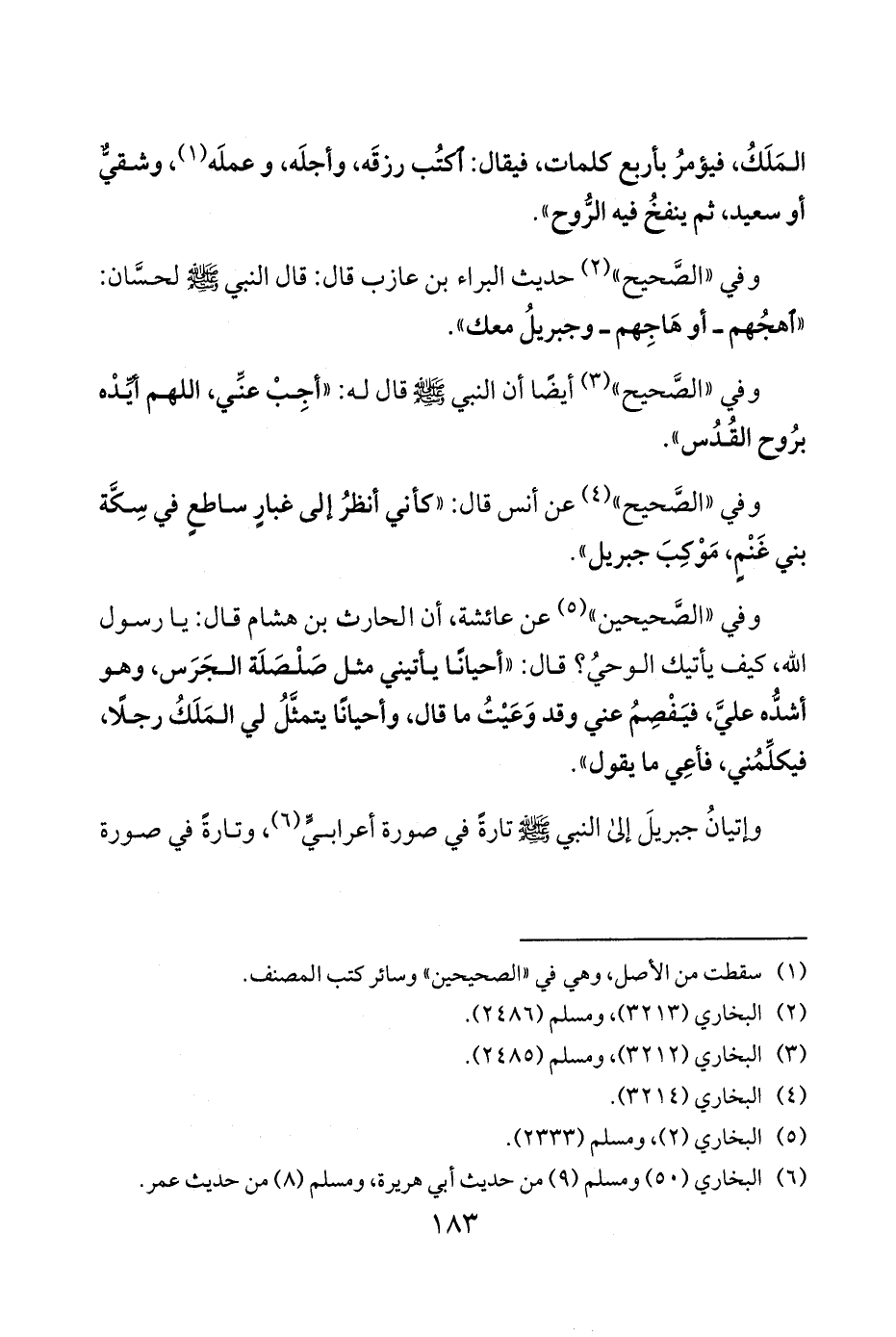 وفي الصَّحيحين 5 عن عائشة أن الحارث بن هشام قال يا رسول الله كيف يأتيك الوحيُ قال «أحيانًا يأتيني مثل صَلْصَلَة الجَرَس وهو أشدُّه عليَّ فيَفْصِمُ عني وقد وَعَيْتُ ما قال وأحيانًا يتمثَّلُ لي المَلَكُ رجلًا فيكلِّمُني فأعِي ما يقول».