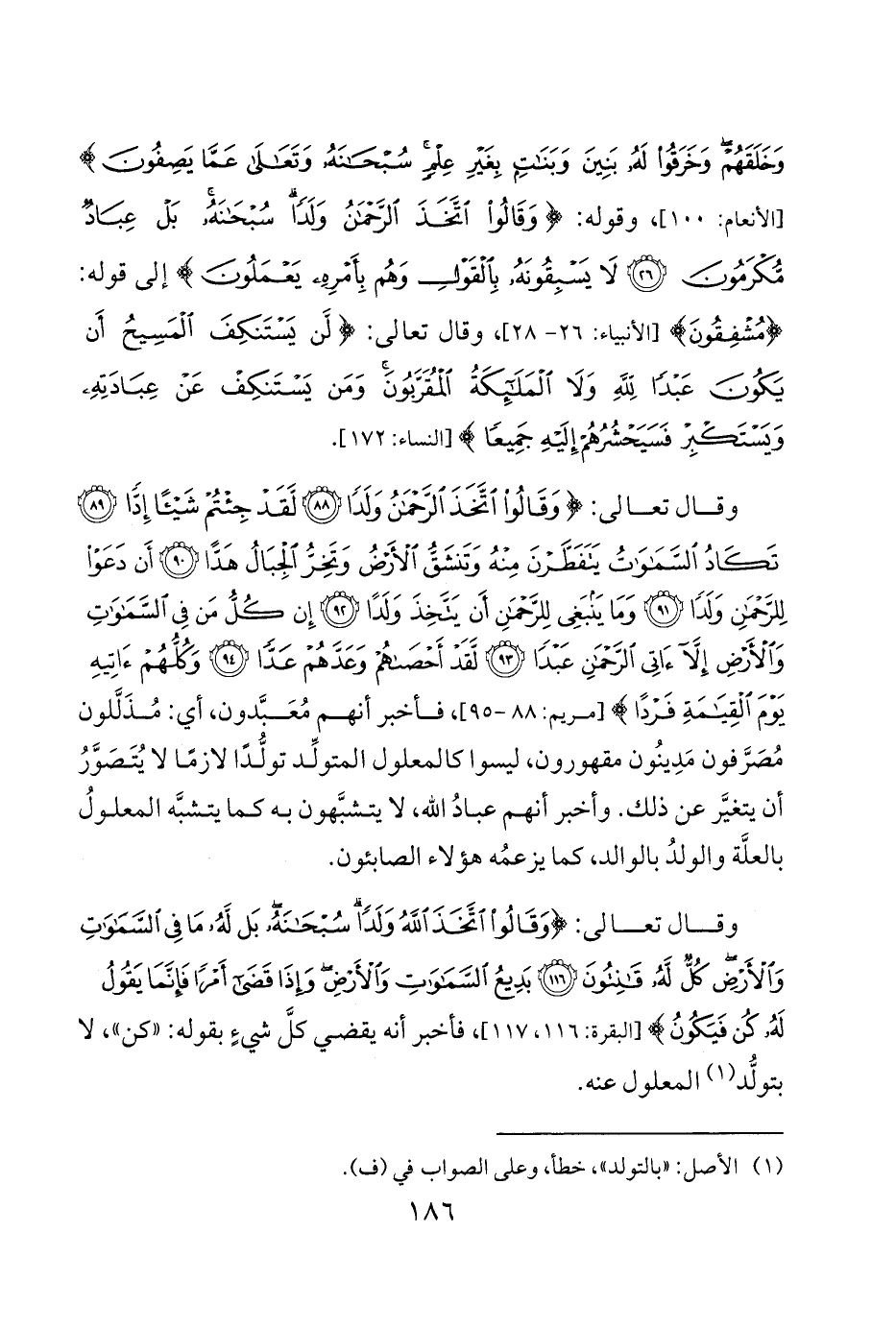 وقال تعالى {وَقَالُوا اتَّخَذَ الرَّحْمَنُ وَلَدًا • لَقَدْ جِئْتُمْ شَيْئًا إِدًّا • تَكَادُ السَّمَاوَاتُ يَتَفَطَّرْنَ مِنْهُ وَتَنْشَقُّ الْأَرْضُ وَتَخِرُّ الْجِبَالُ هَدًّا • أَنْ دَعَوْا لِلرَّحْمَنِ وَلَدًا • وَمَا يَنْبَغِي لِلرَّحْمَنِ أَنْ يَتَّخِذَ وَلَدًا • إِنْ كُلُّ مَنْ فِي السَّمَاوَاتِ وَالْأَرْضِ إِلَّا آتِي الرَّحْمَنِ عَبْدًا • لَقَدْ أَحْصَاهُمْ وَعَدَّهُمْ عَدًّا • وَكُلُّهُمْ آتِيهِ يَوْمَ الْقِيَامَةِ فَرْدًا} فأخبر أنهم مُعَبَّدون أي مُذَلَّلون مُصَرَّفون مَدِينُون مقهورون ليسوا كالمعلول المتولِّد تولُّدًا لازمًا لا يُتَصَوَّرُ أن يتغيَّر عن ذلك وأخبر أنهم عبادُ لله لا يتشبَّهون به كما يتشبَّه المعلولُ بالعلَّة والولدُ بالوالد كما يزعمُه هؤلاء الصابئون.