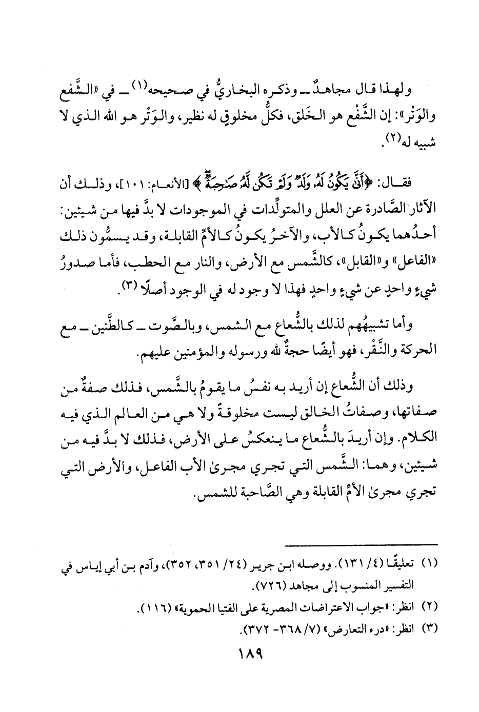وذلك أن الشُّعاع إن أريد به نفسُ ما يقومُ بالشَّمس فذلك صفةٌ من صفاتها وصفاتُ الخالق ليست مخلوقةً ولا هي من العالم الذي فيه الكلام وإن أريدَ بالشُّعاع ما ينعكسُ على الأرض فذلك لا بدَّ فيه من شيئين وهما الشَّمس التي تجري مجرى الأب الفاعل والأرض التي تجري مجرى الأمِّ القابلة وهي الصَّاحبة للشمس.