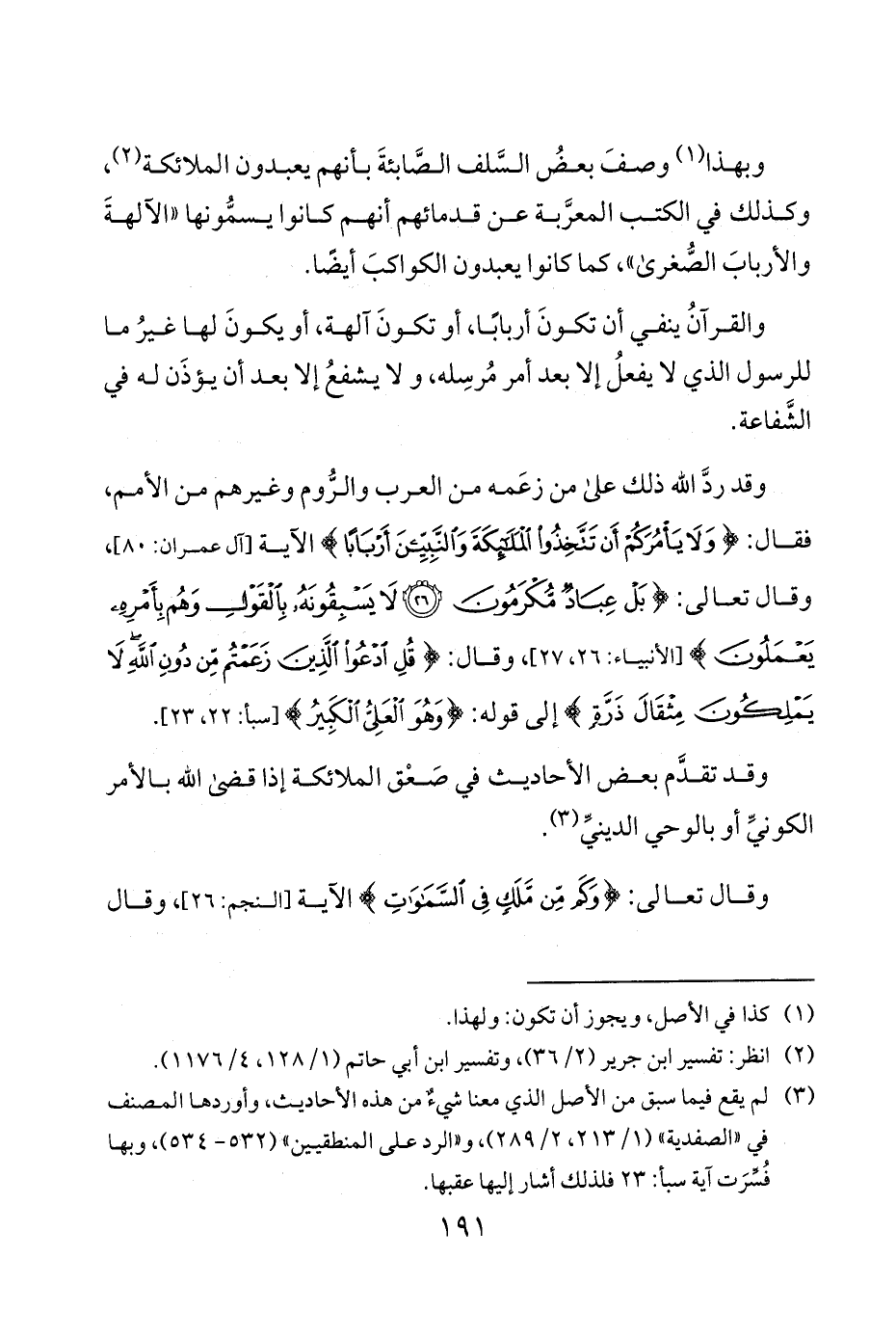 وبهذا 1 وصفَ بعضُ السَّلف الصَّابئةَ بأنهم يعبدون الملائكة 2 وكذلك في الكتب المعرَّبة عن قدمائهم أنهم كانوا يسمُّونها الآلهةَ والأربابَ الصُّغرى كما كانوا يعبدون الكواكبَ أيضًا.