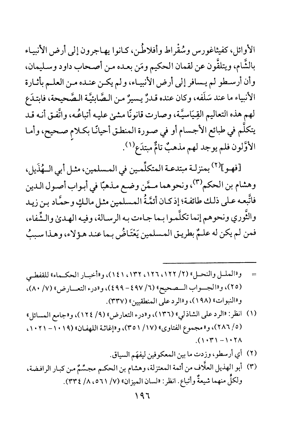 [فهو] 1 بمنزلة مبتدعة المتكلِّمين في المسلمين مثل أبي الهُذَيل وهشام بن الحكم 3 ونحوهما ممَّن وضع مذهبًا في أبواب أصول الدين فاتَّبعه على ذلك طائفة إذ كان أئمَّةُ المسلمين مثل مالكٍ وحمَّاد بن زيد والثَّوري ونحوهم إنما تكلَّموا بما جاءت به الرسالة وفيه الهدى والشِّفاء فمن لم يكن له علمٌ بطريق المسلمين يَعْتَاضُ عنه بما عند هؤلاء وهذا سببُ